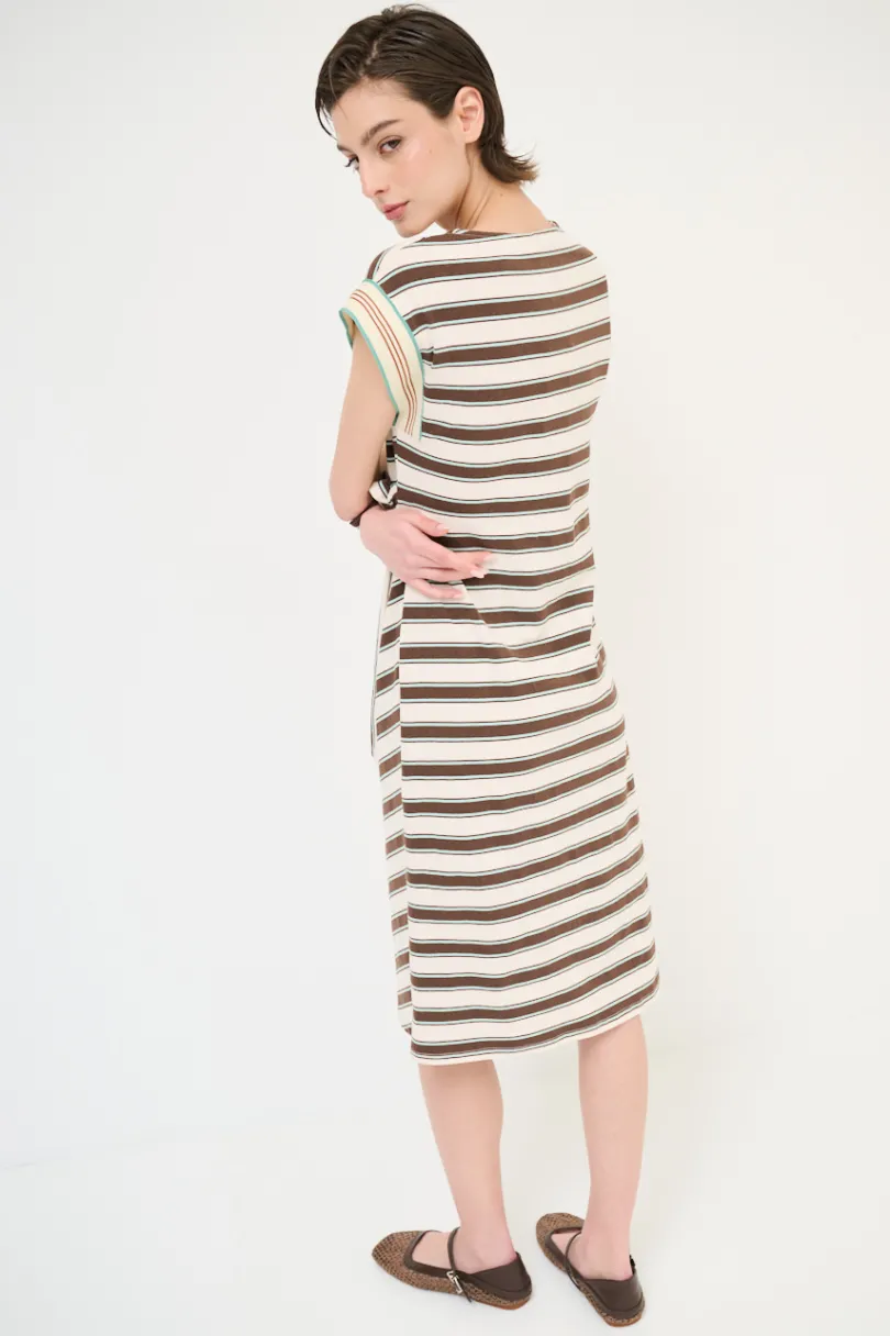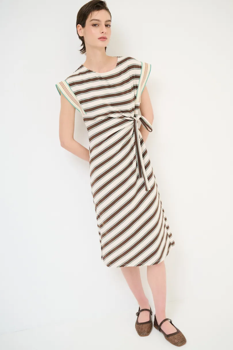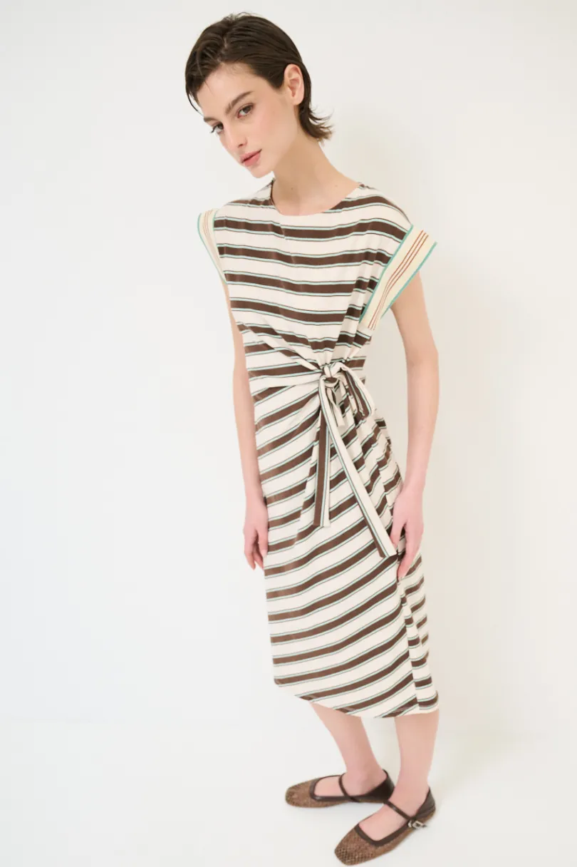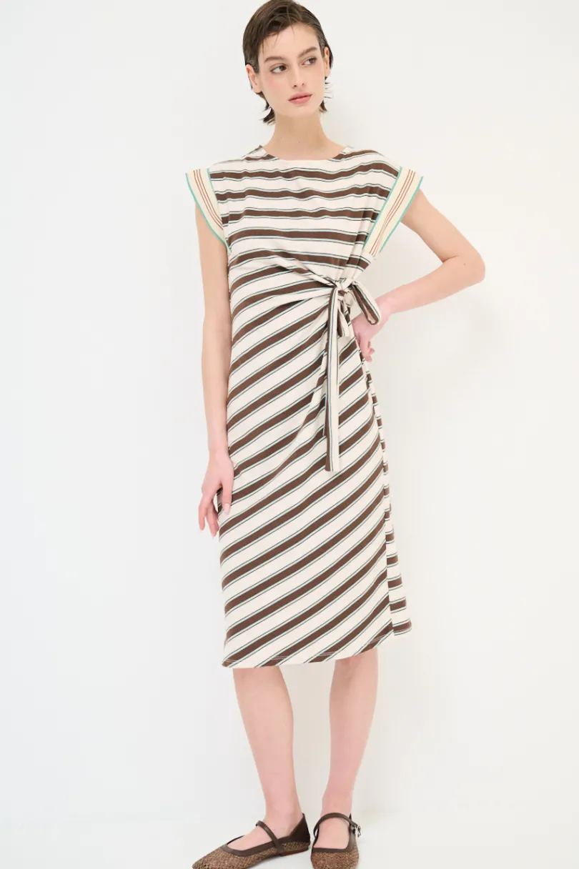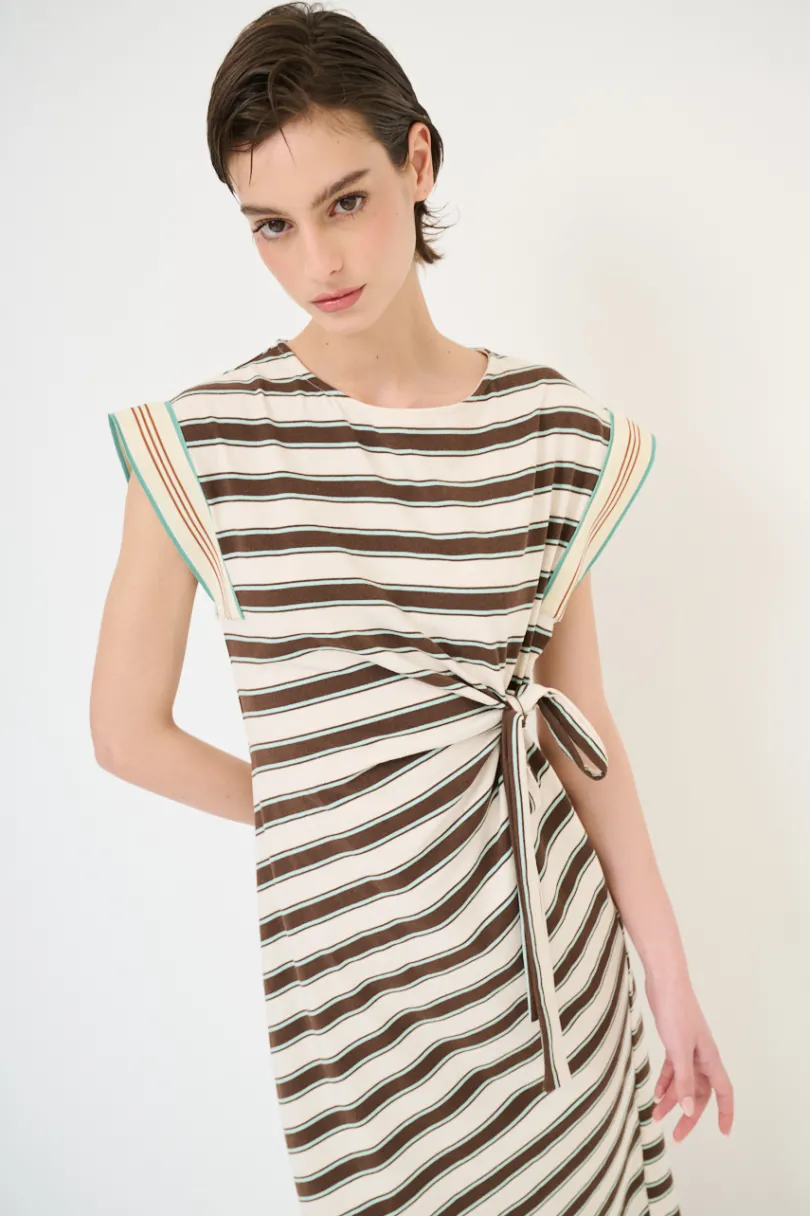 Abito a righe con passamaneria intorno al giromanica, con girocollo e annodato sul fianco.