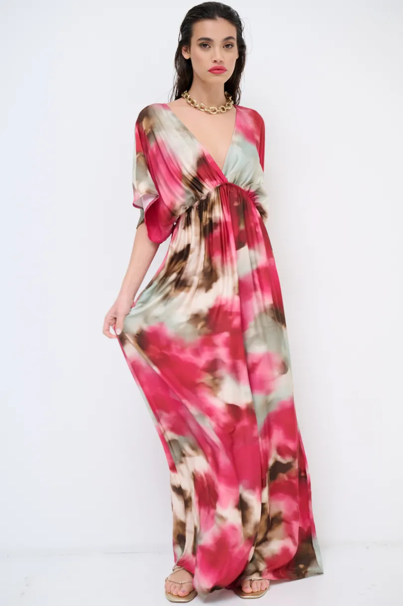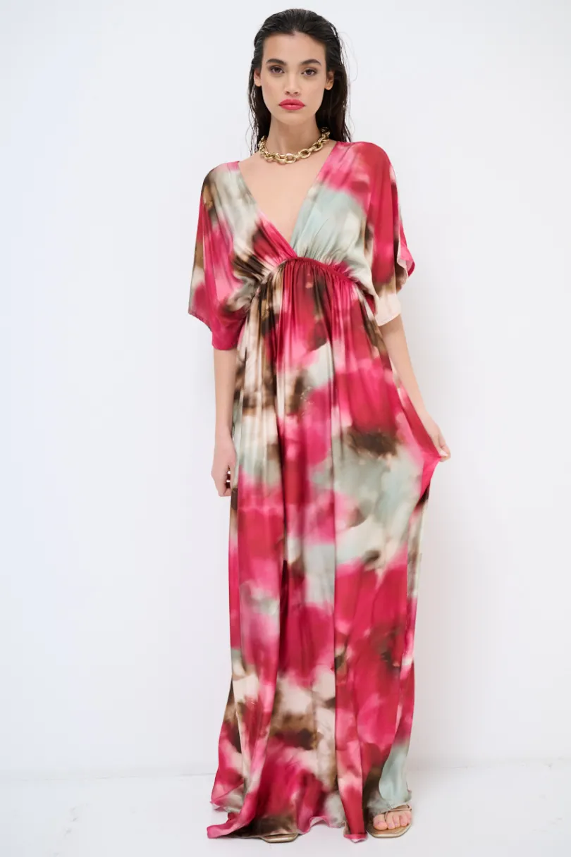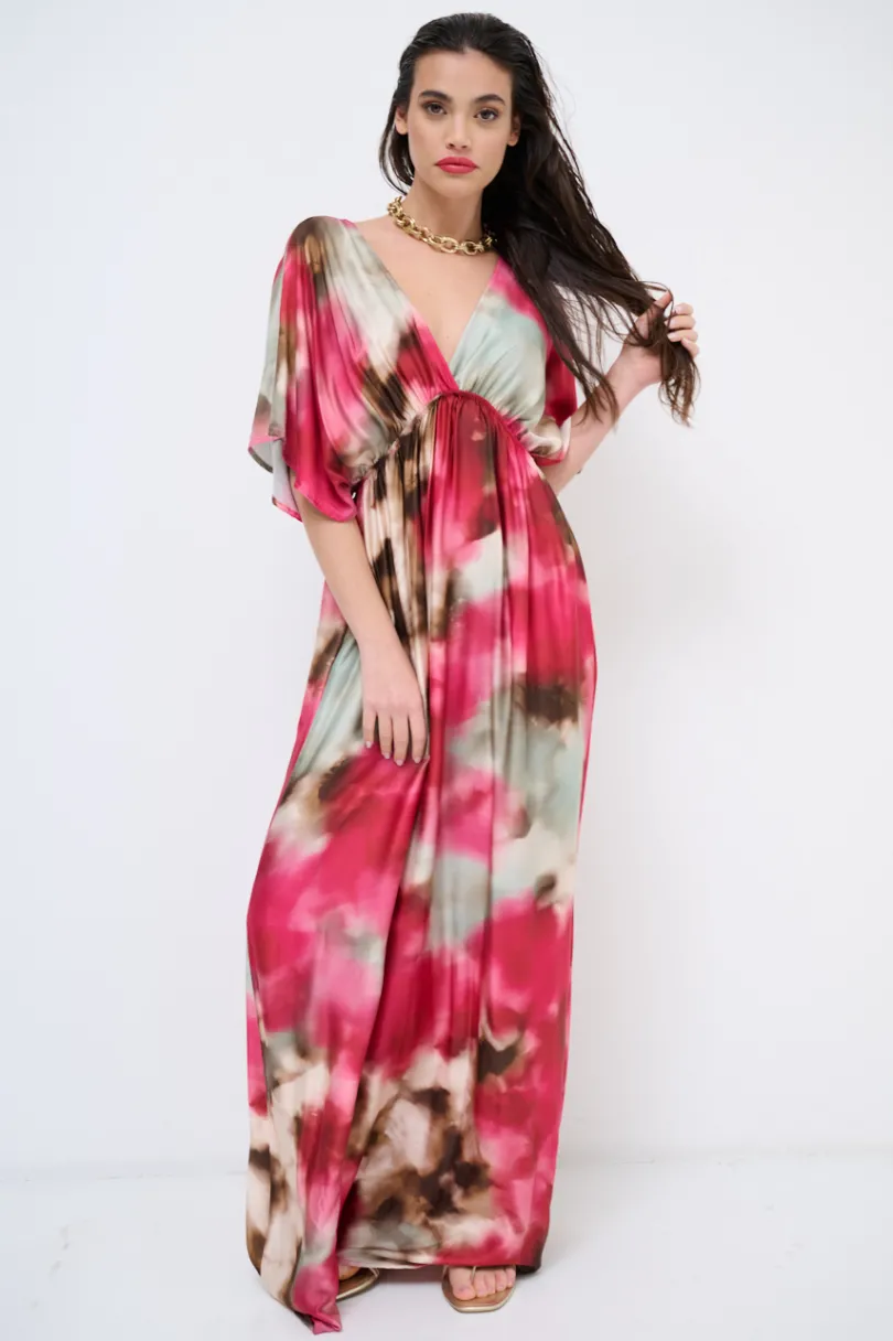Abito lungo a fantasia sfumata in raso con ampia scollatura a v e manica ad aletta.