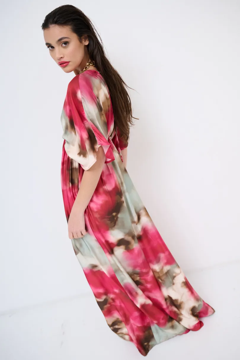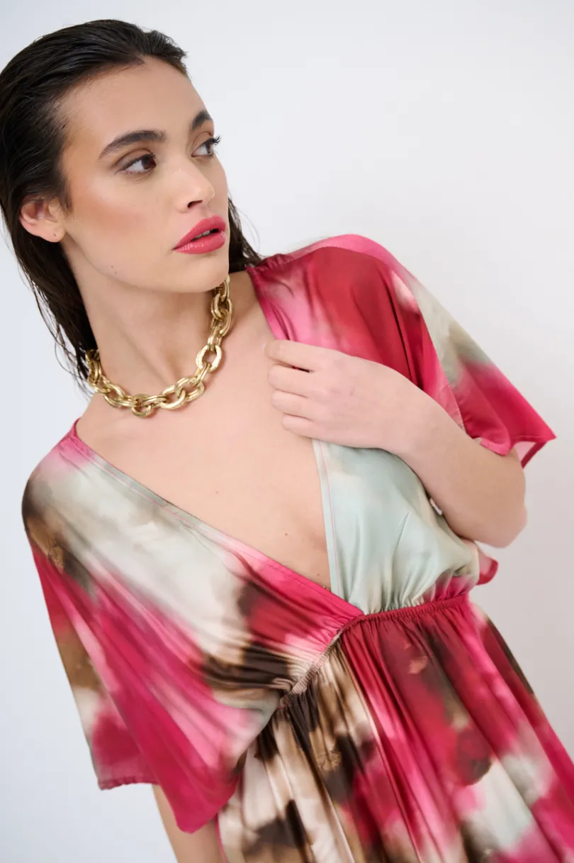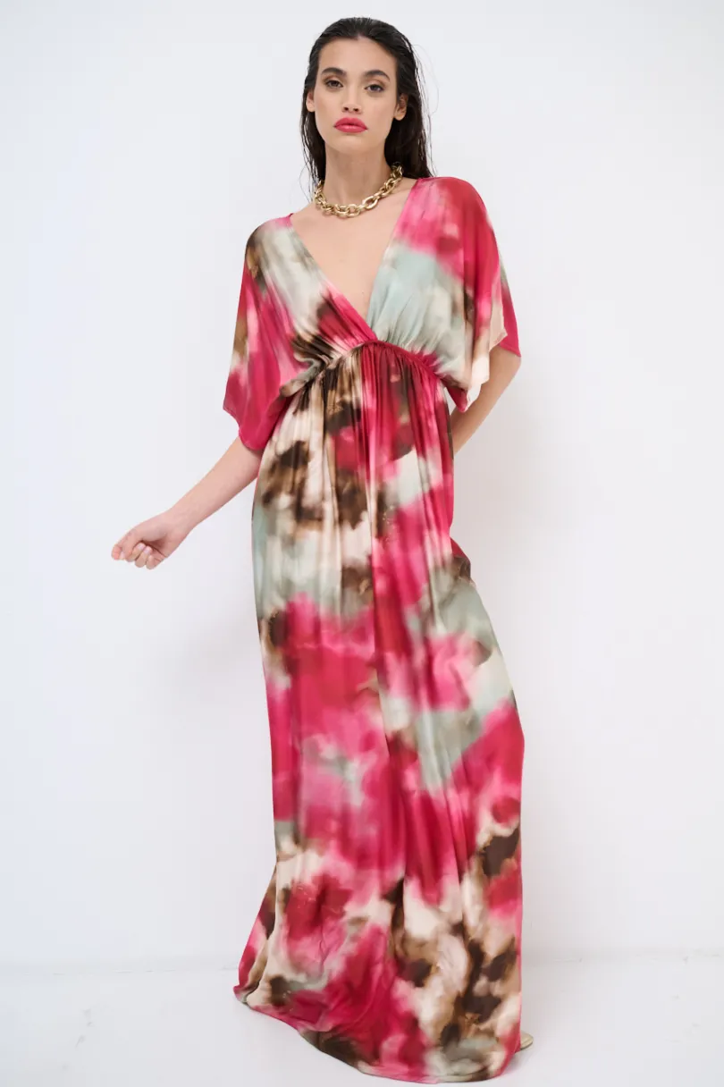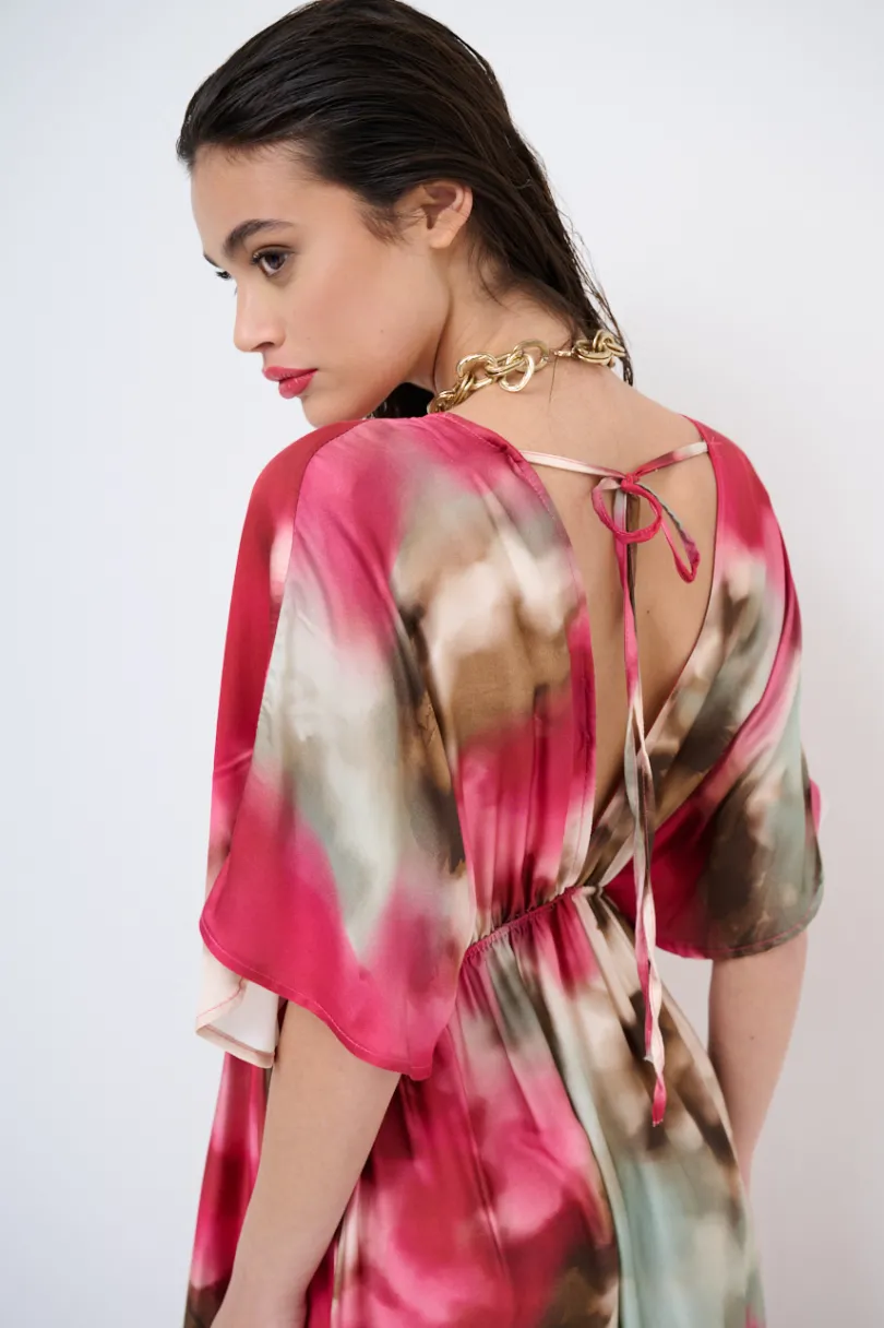 Abito lungo a fantasia sfumata in raso con ampia scollatura a v e manica ad aletta.