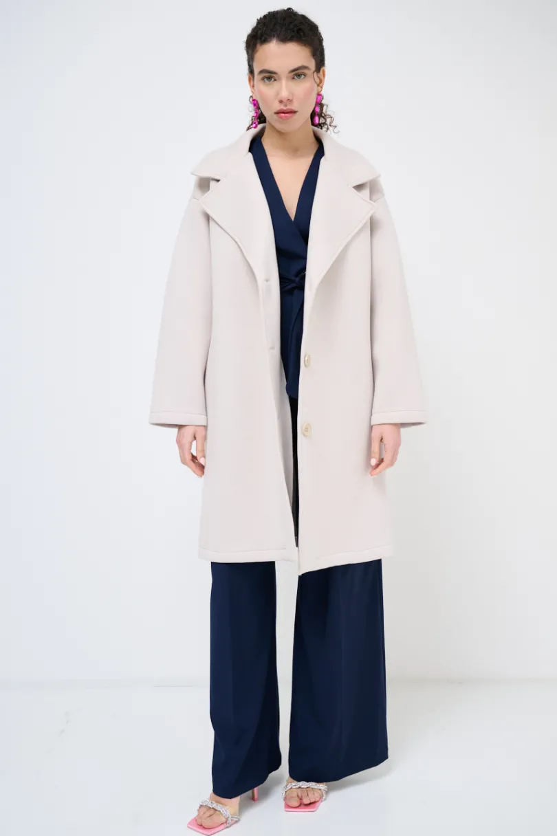 Cappotto classico a tre bottoni in neoprene con tasche nascoste sul fianco, con collo rever.