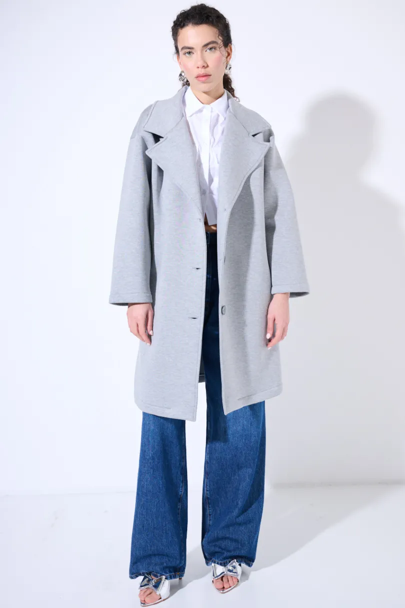 Cappotto classico a tre bottoni in neoprene con tasche nascoste sul fianco, con collo rever.