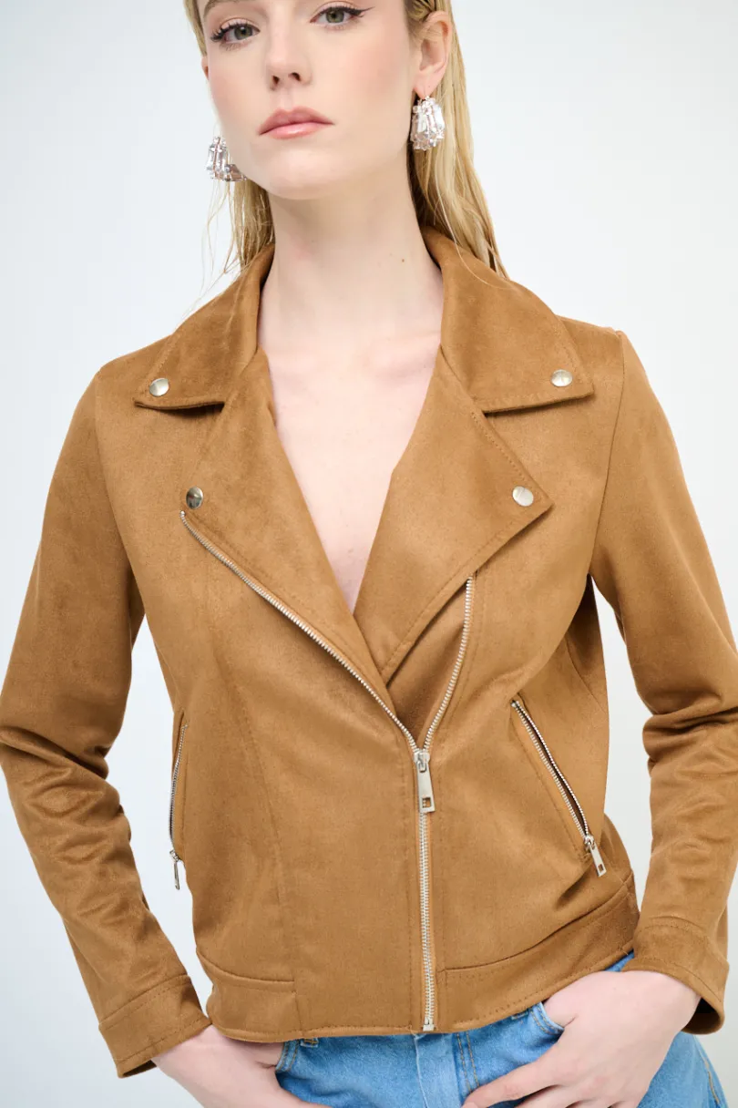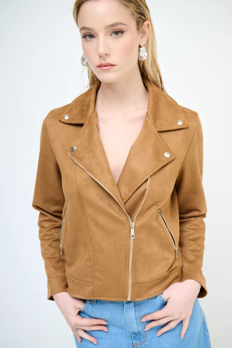 Giubbotto slim in dainetto, con zip asimmetrica e colletto rever con borchie.