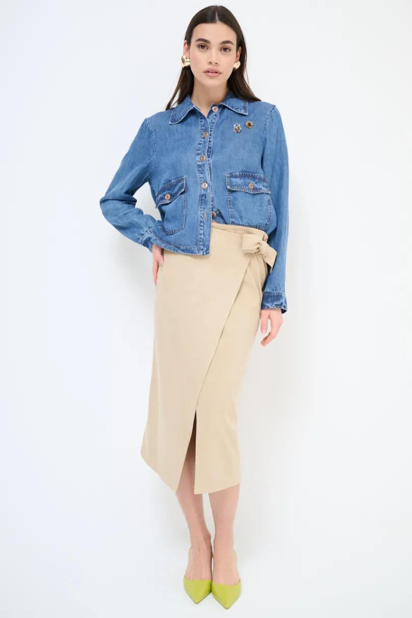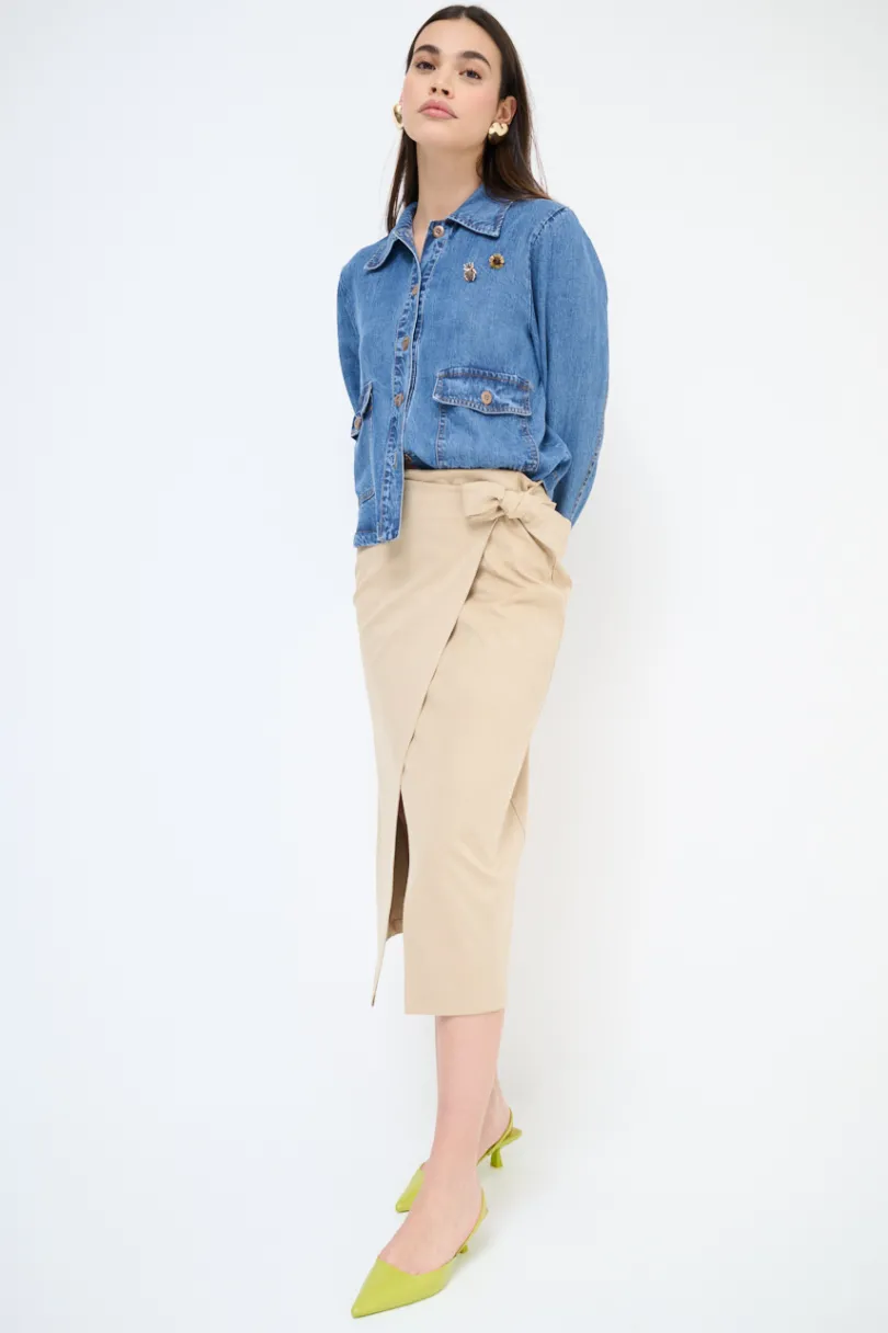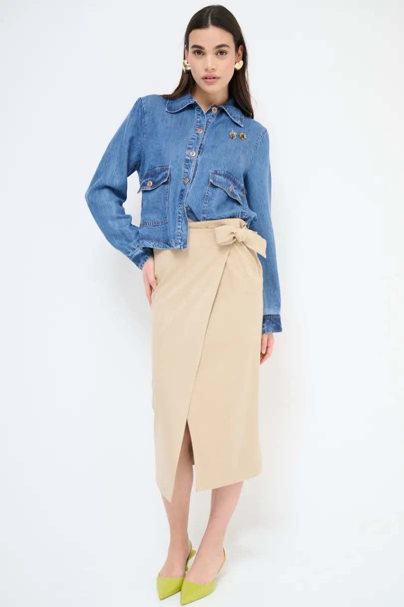 Gonna a portafoglio in eco dainetto, annodata sul lato.