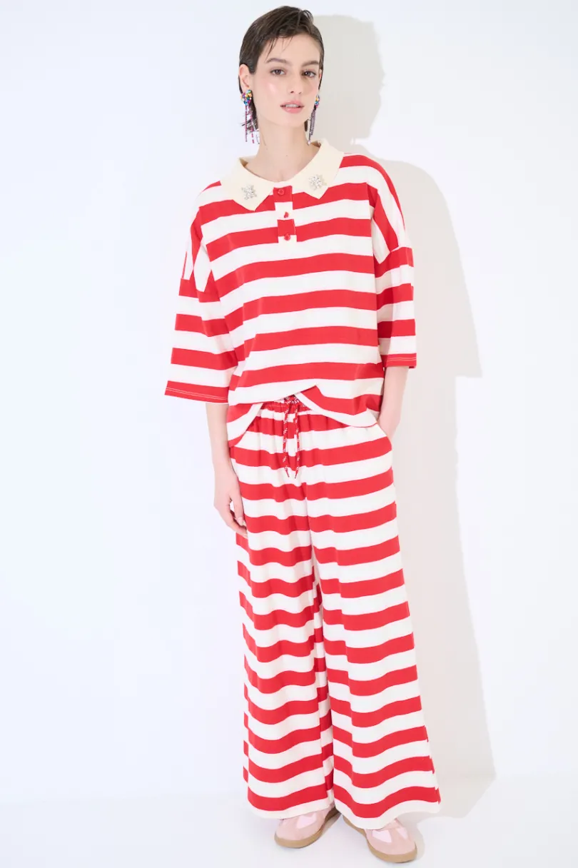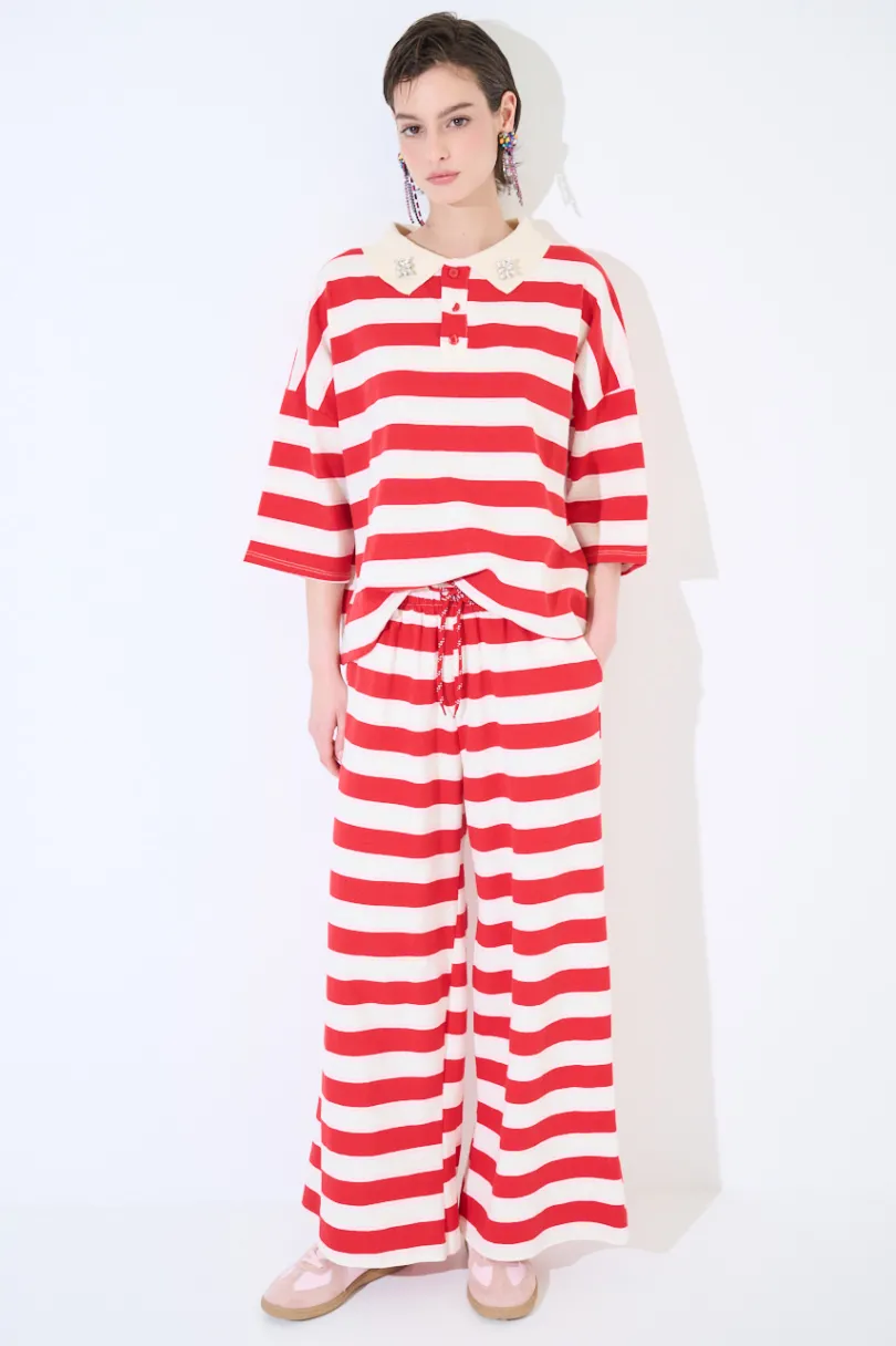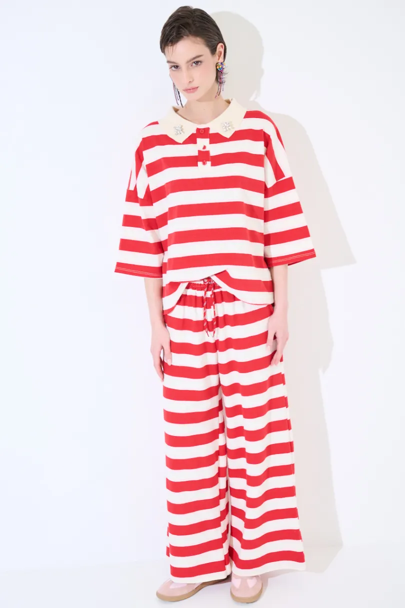 Pantalone ampio dritto a righe, con elastico in vita e coulisse.