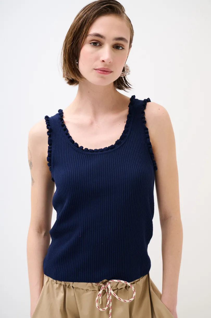 Canotta in maglia a costine con giromanica e girocollo con rouches.