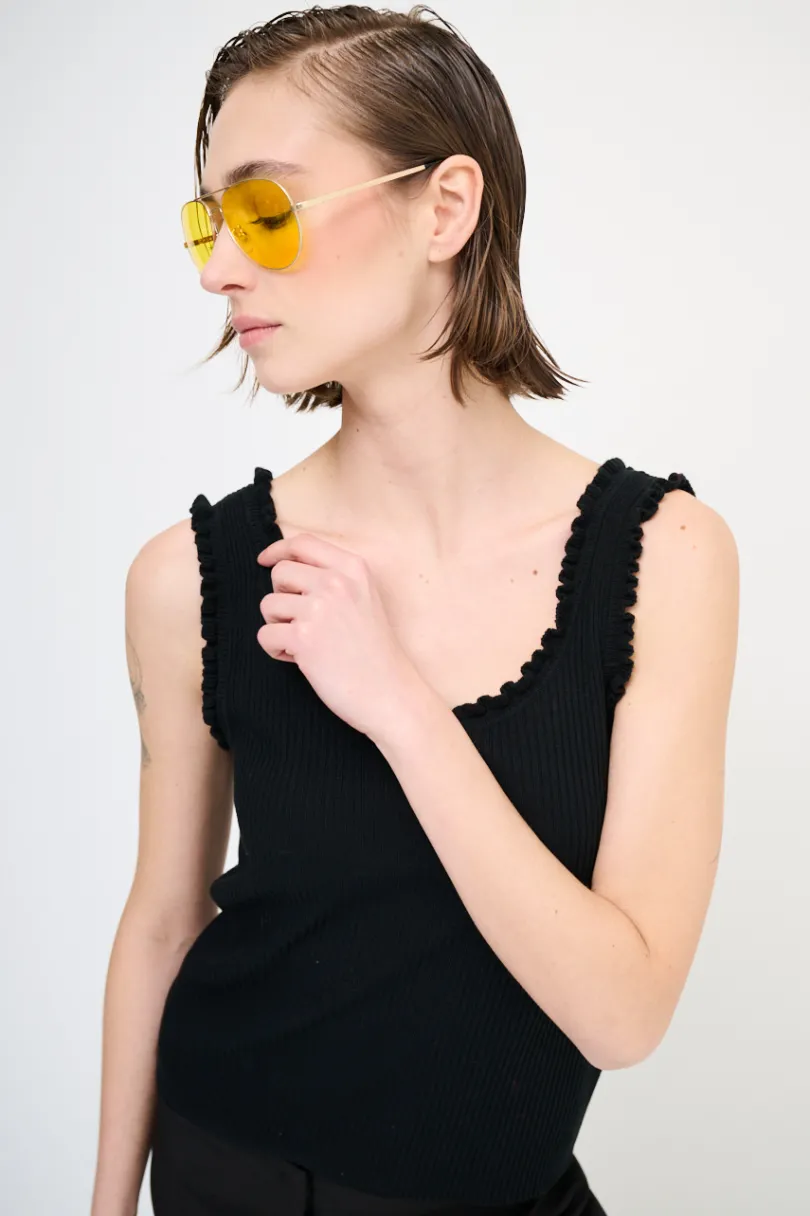 Canotta in maglia a costine con giromanica e girocollo con rouches.