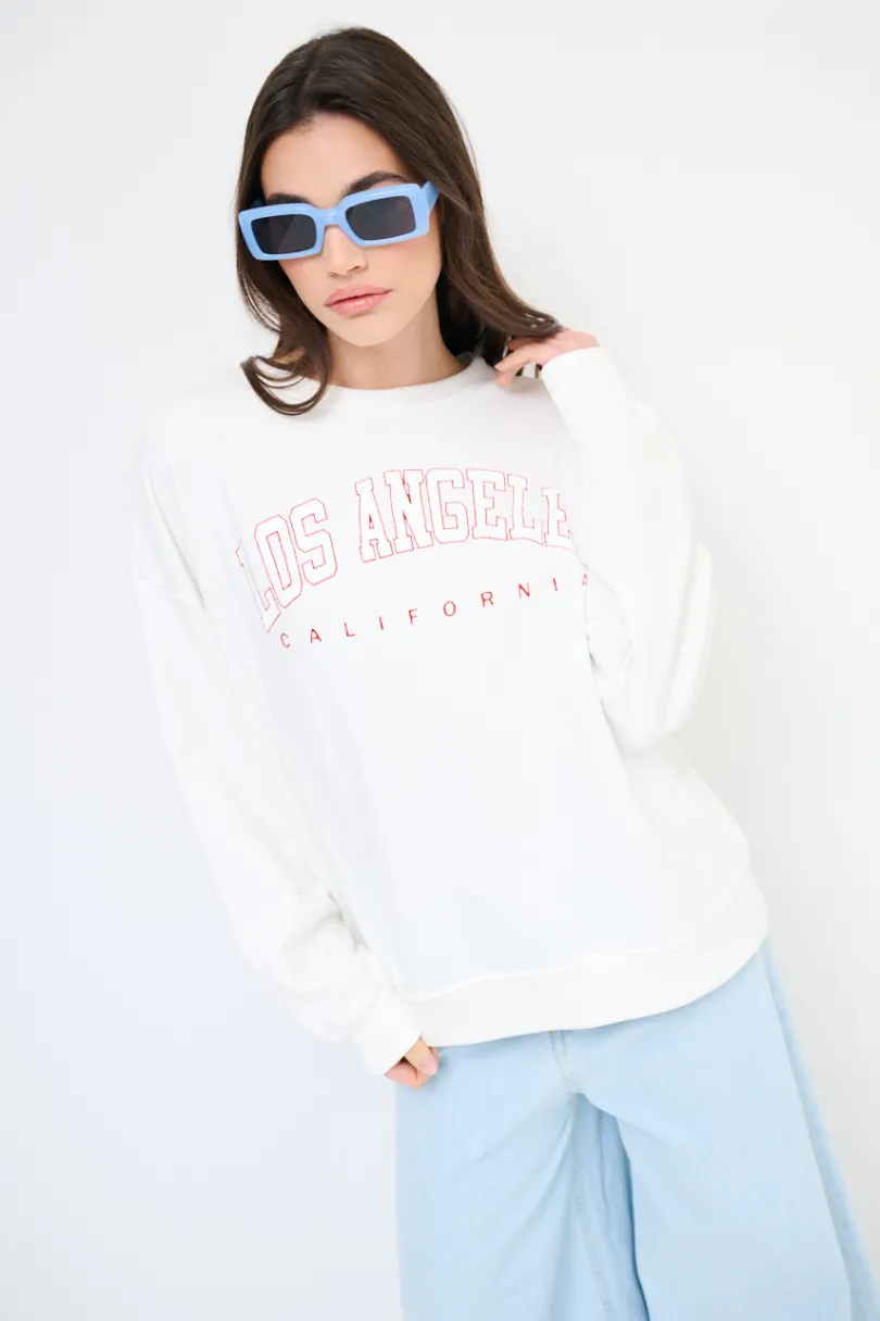 Felpa oversize garzata con stampa Los Angeles con profili con riga lurex, con manica calata.