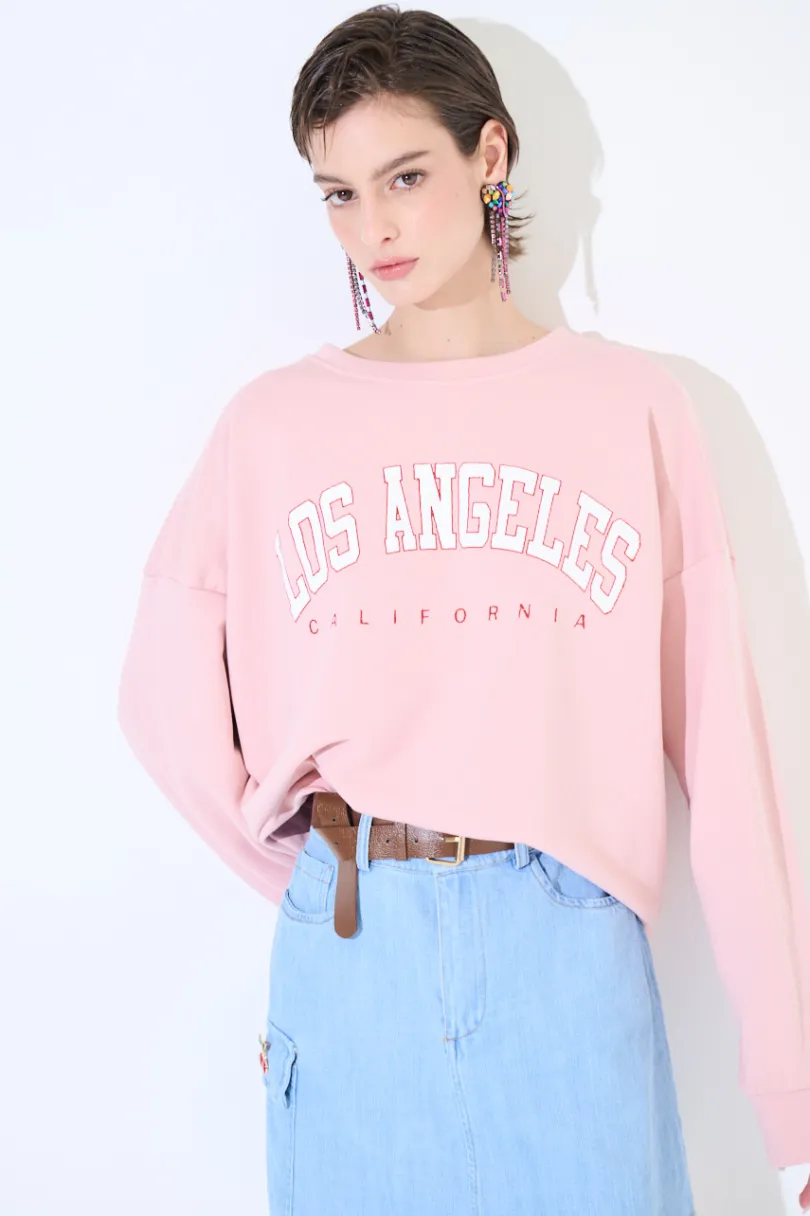 Felpa oversize garzata con stampa Los Angeles con profili con riga lurex, con manica calata.