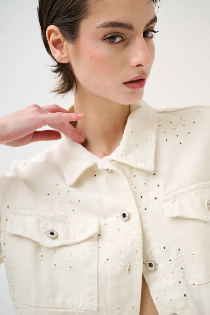 Giubbotto crop in cotone ricamato con disegno con taschini frontali, taglio vivo sul fondo e abbottonata sul davanti.