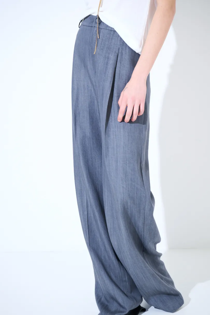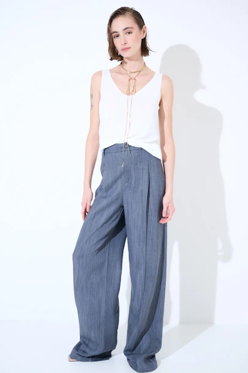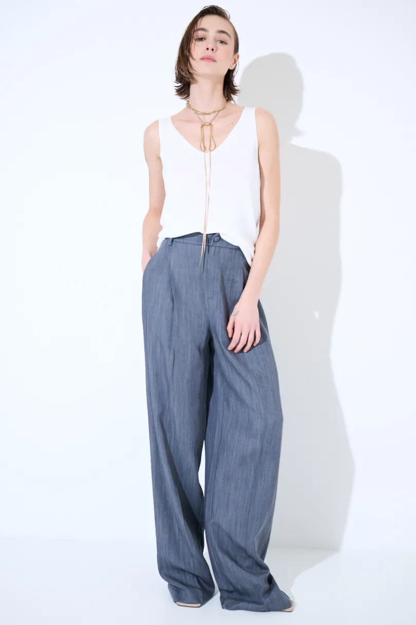 Panta denim a palazzo con piega centrale e pinces, bottone foderato e passanti per cintura.