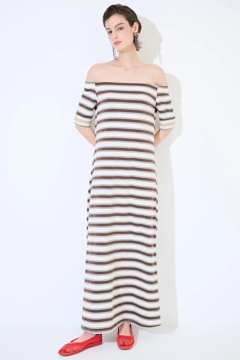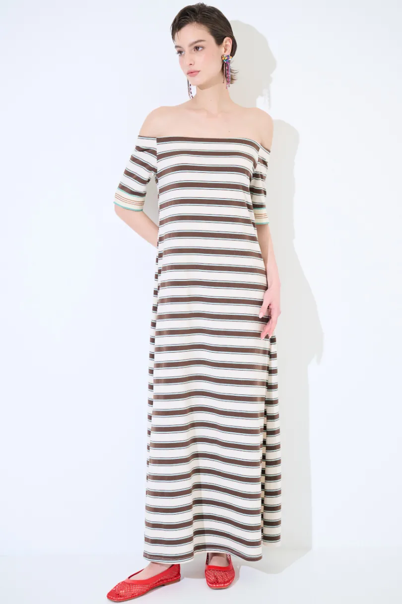 Abito lungo a righe con scollo shiffer e passamaneria sul giromanica.