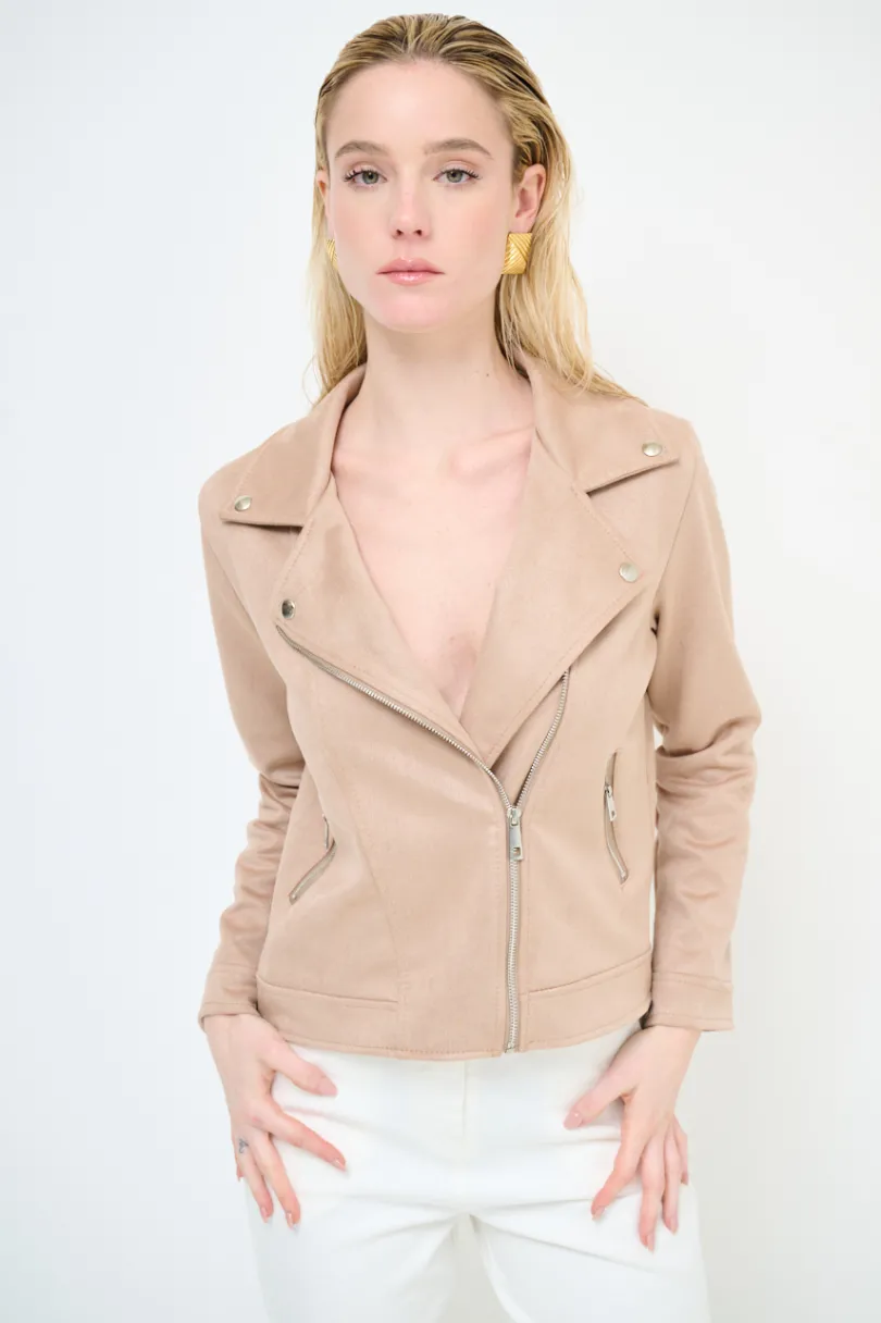 Giubbotto slim in dainetto, con zip asimmetrica e colletto rever con borchie.