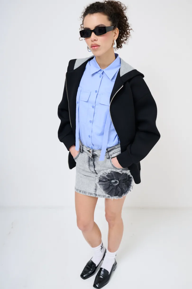 Felpa oversize lunga in neoprene con cappuccio e chiusura a zip centrale.