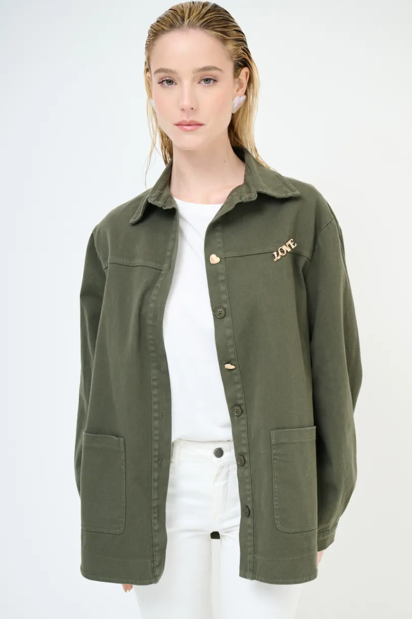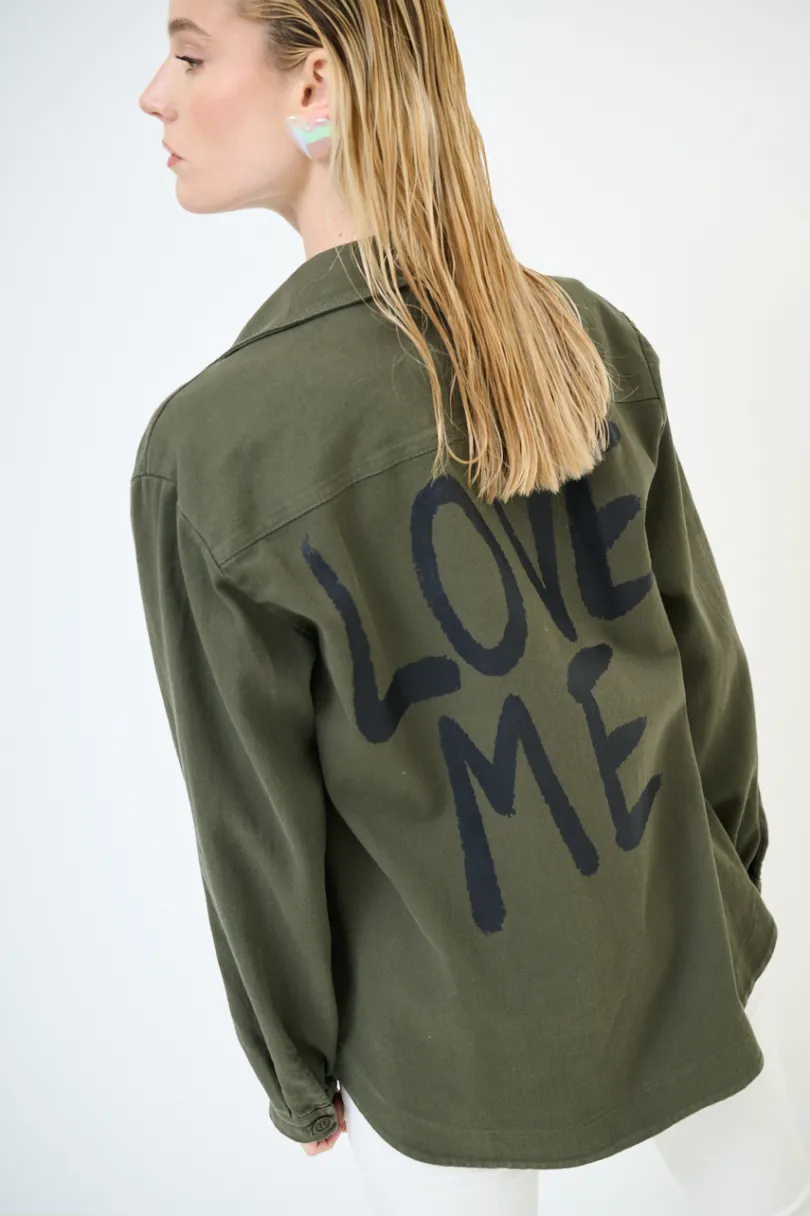 Camicia stile military con taschini, con spilla e bottoni dorati a cuore sul davanti e stampa “Love me” sulla schiena, abbottonata sul davanti.