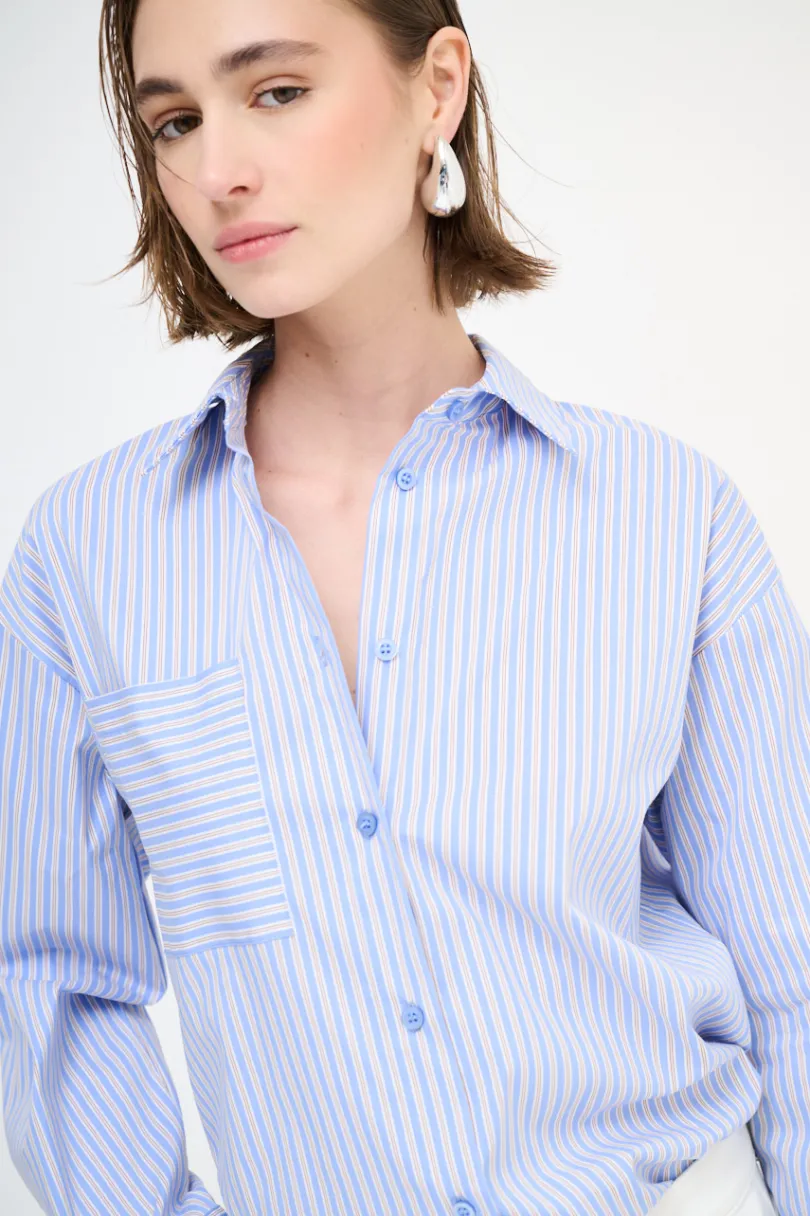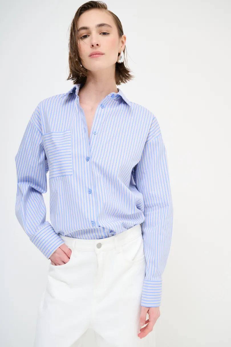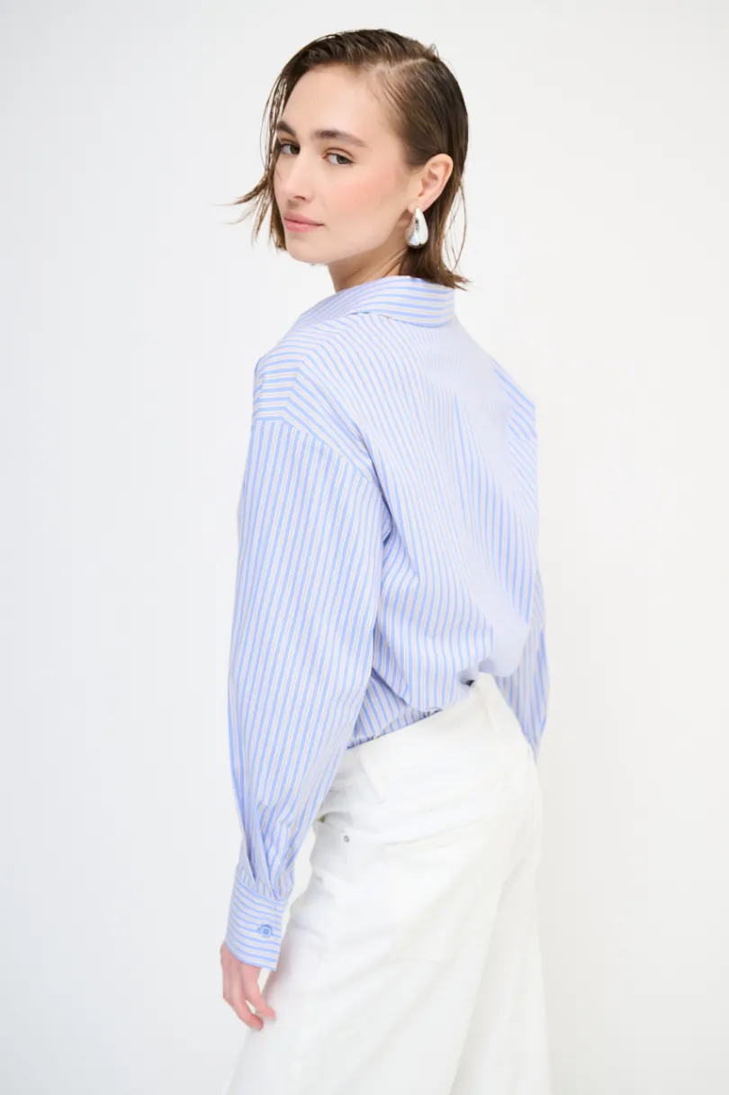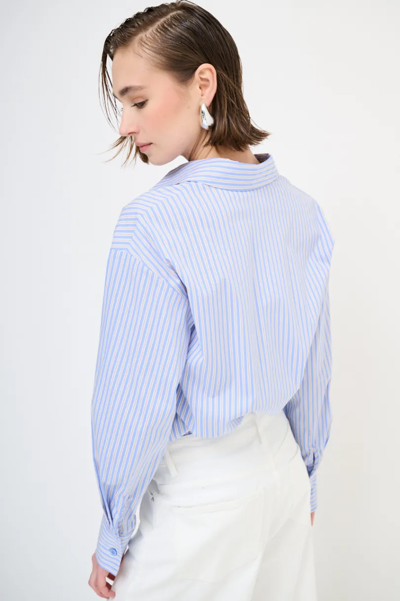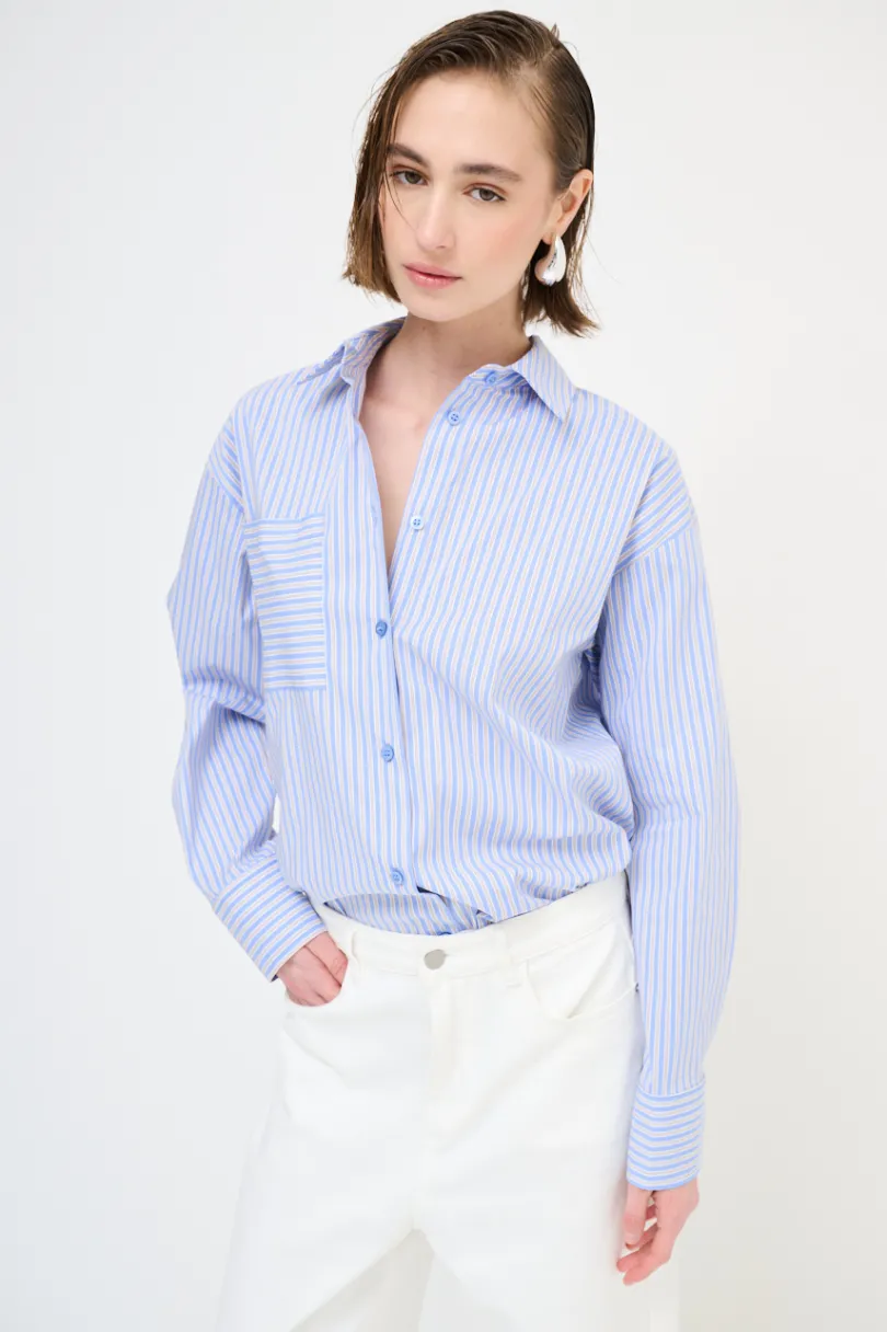 Camicia over a righe con manica lunga con polsino alto e taschino frontale.