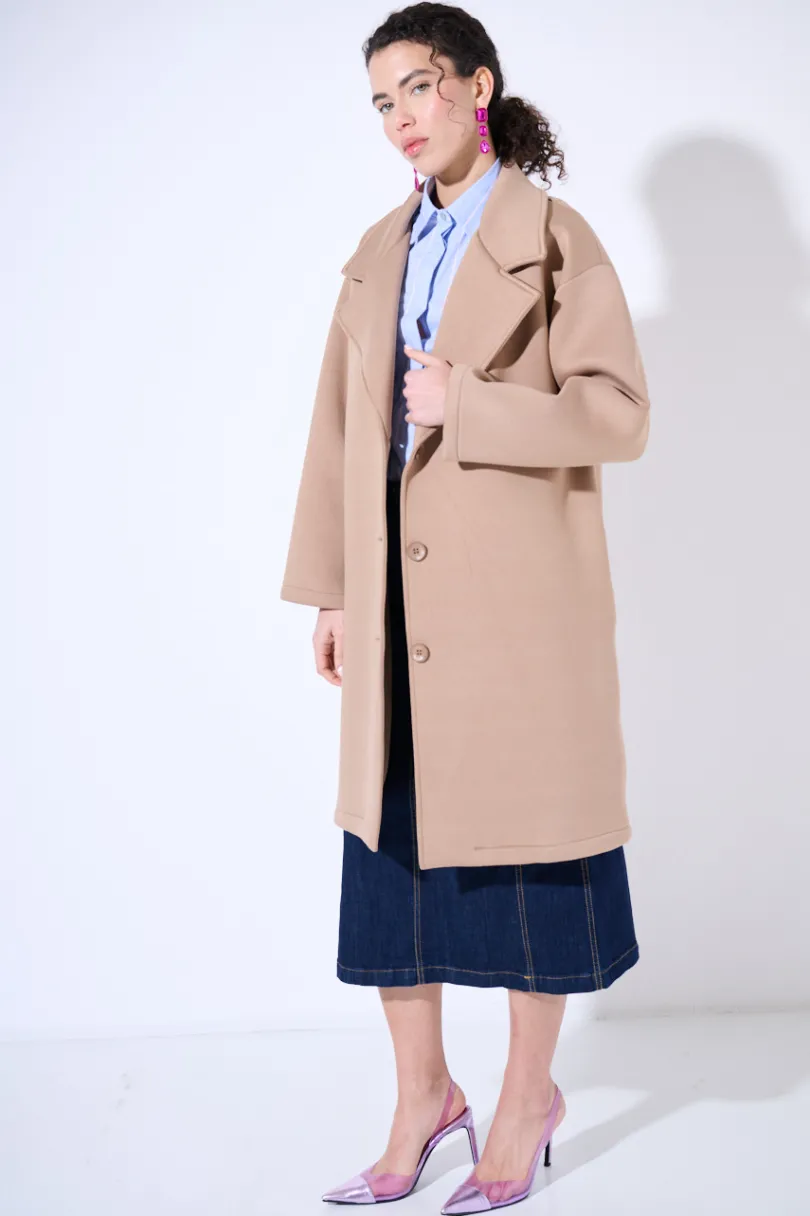 Cappotto classico a tre bottoni in neoprene con tasche nascoste sul fianco, con collo rever.