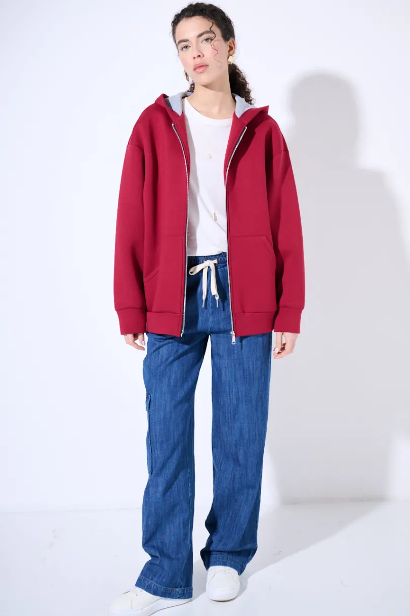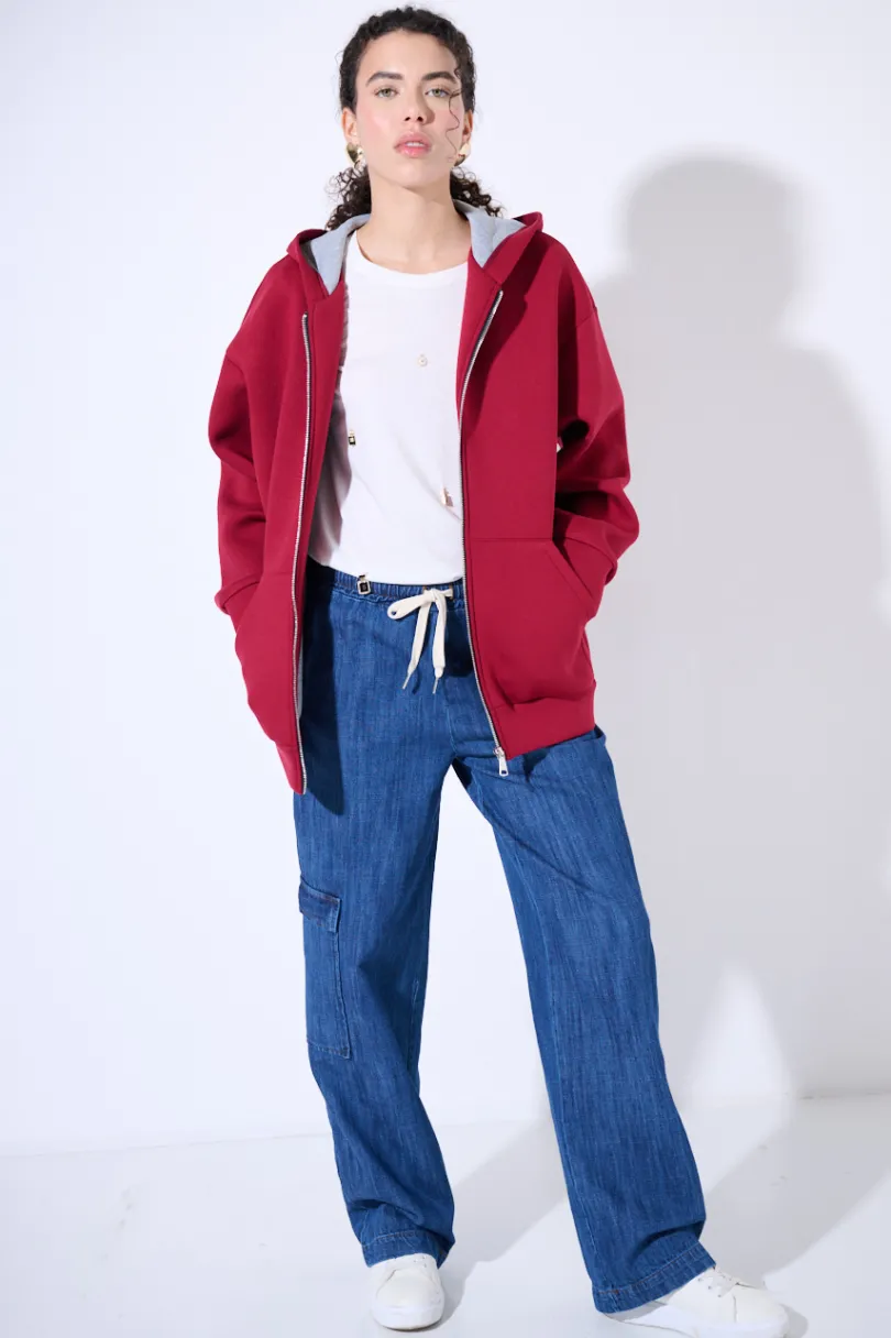 Felpa oversize lunga in neoprene con cappuccio e chiusura a zip centrale.