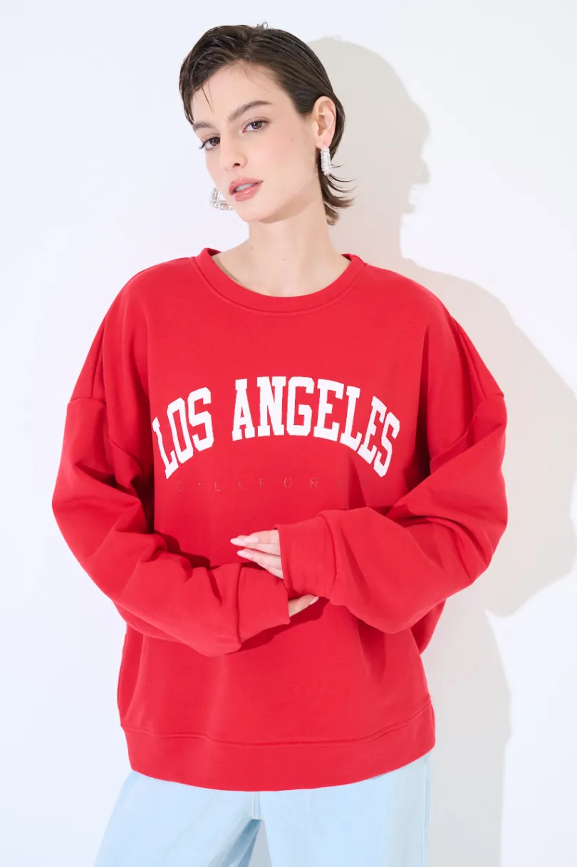 Felpa oversize garzata con stampa Los Angeles con profili con riga lurex, con manica calata.
