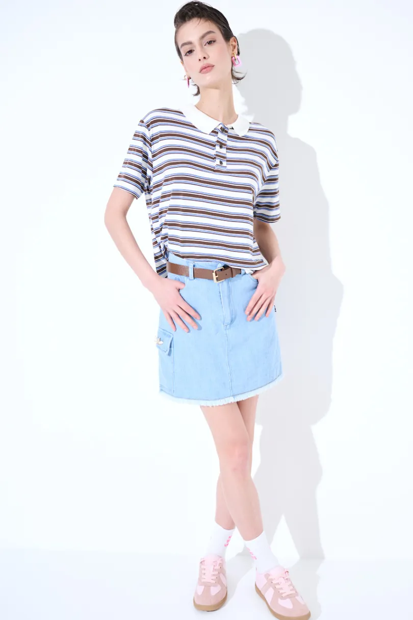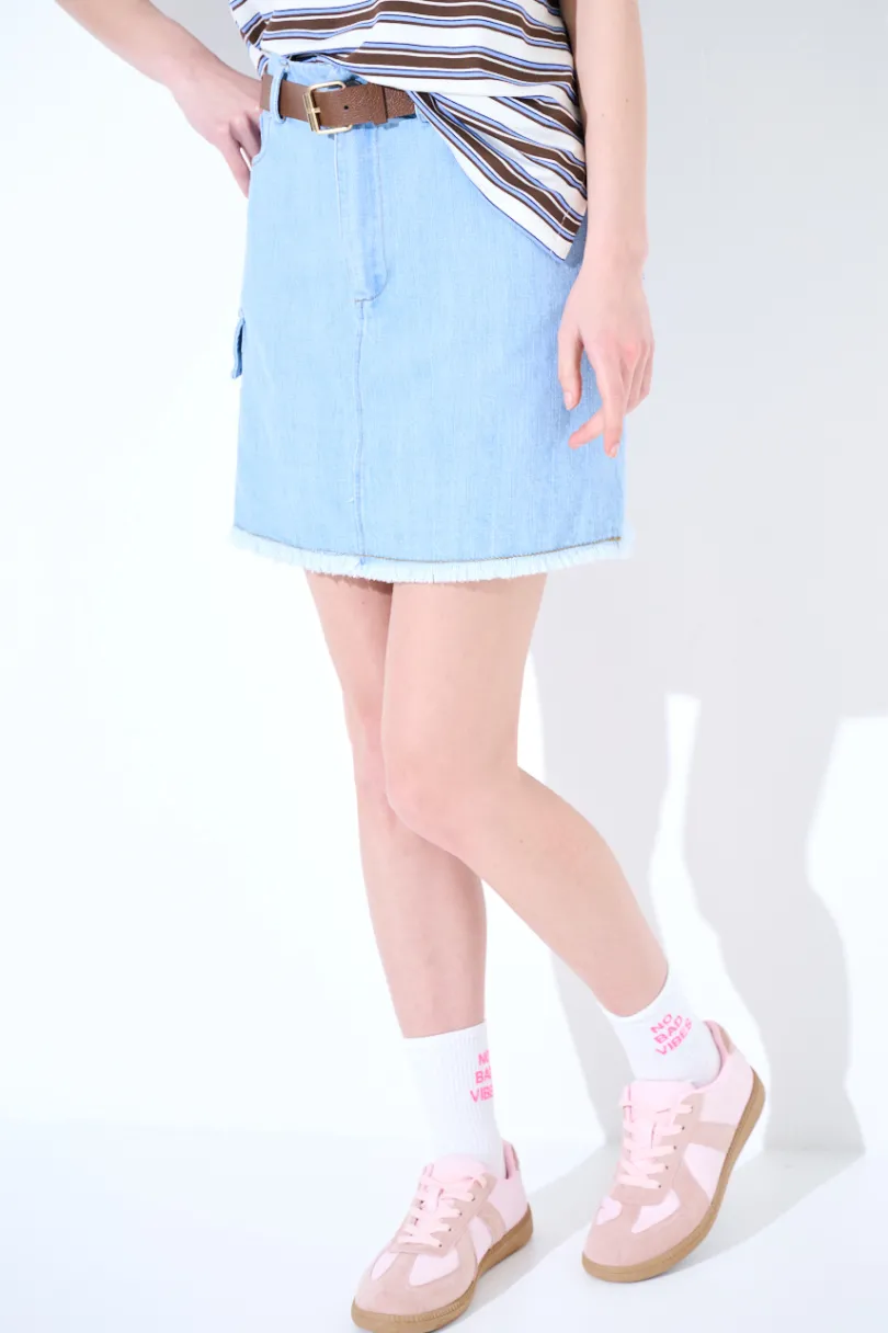 Minigonna in denim sfrangiata sul fondo, taschino laterale con spilla e cintura in vita.