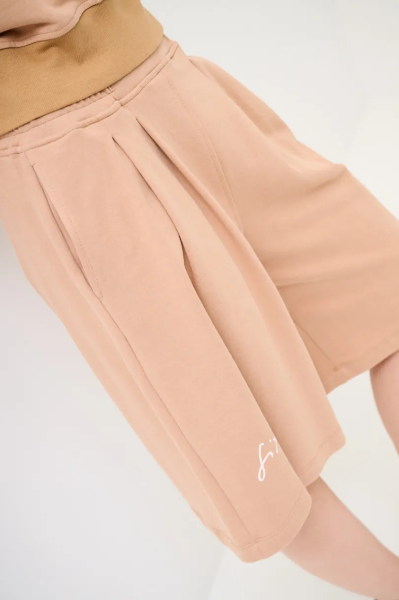 Bermuda in felpa garzata con stampa “Six”, pinces frontali e elasticizzato in vita.