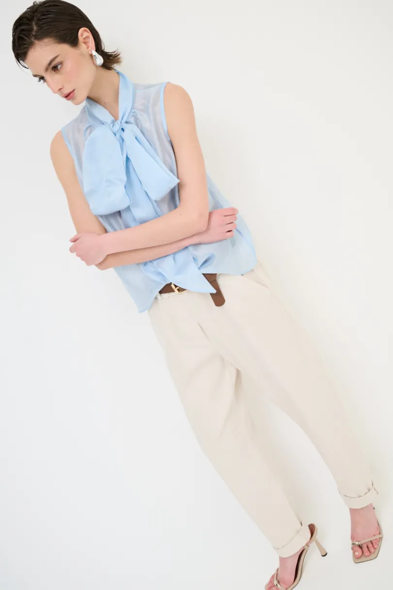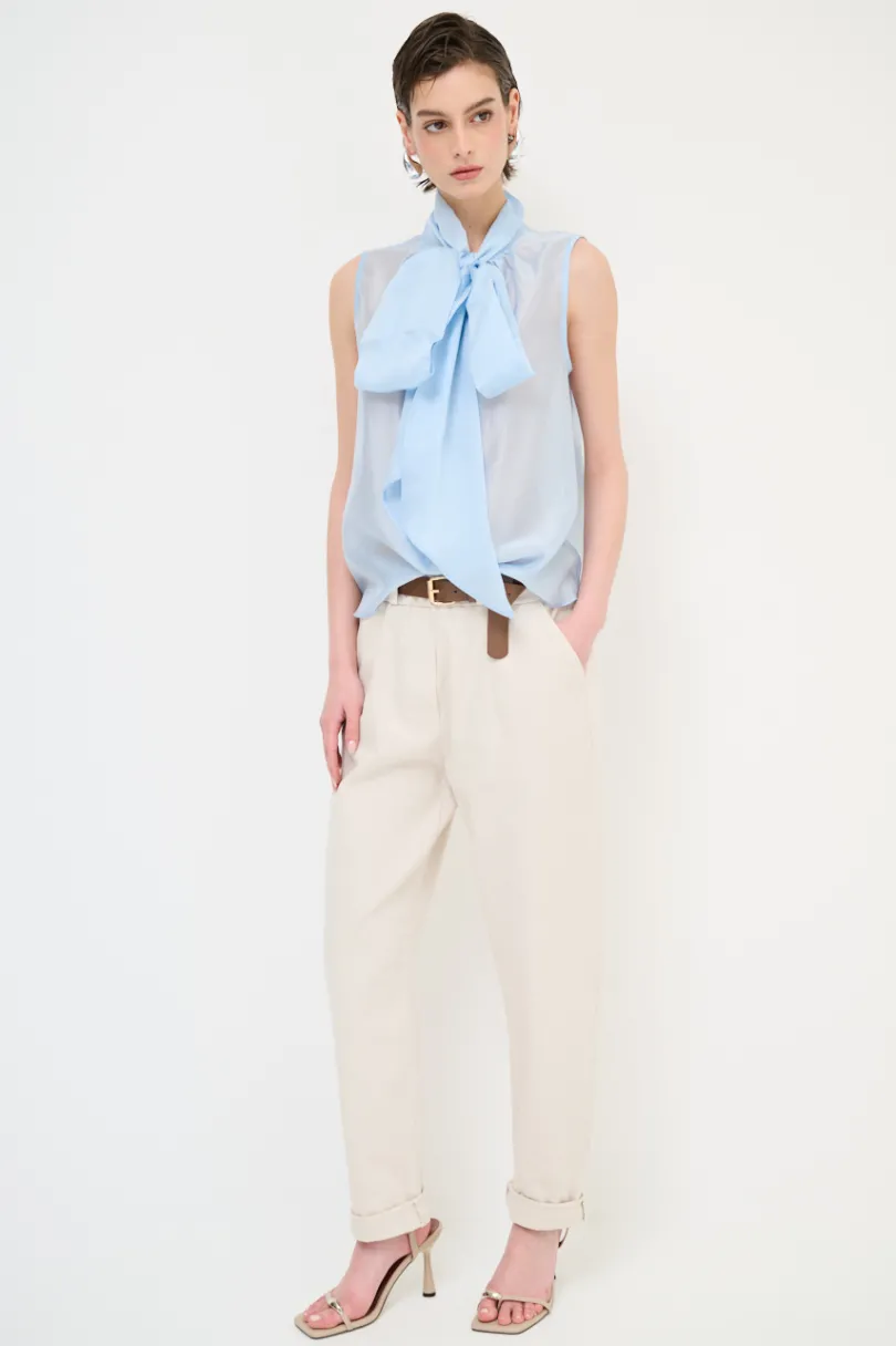 Pantalone dritto in cotone con tasche a filetto con bottone sul retro e cintura in vita.