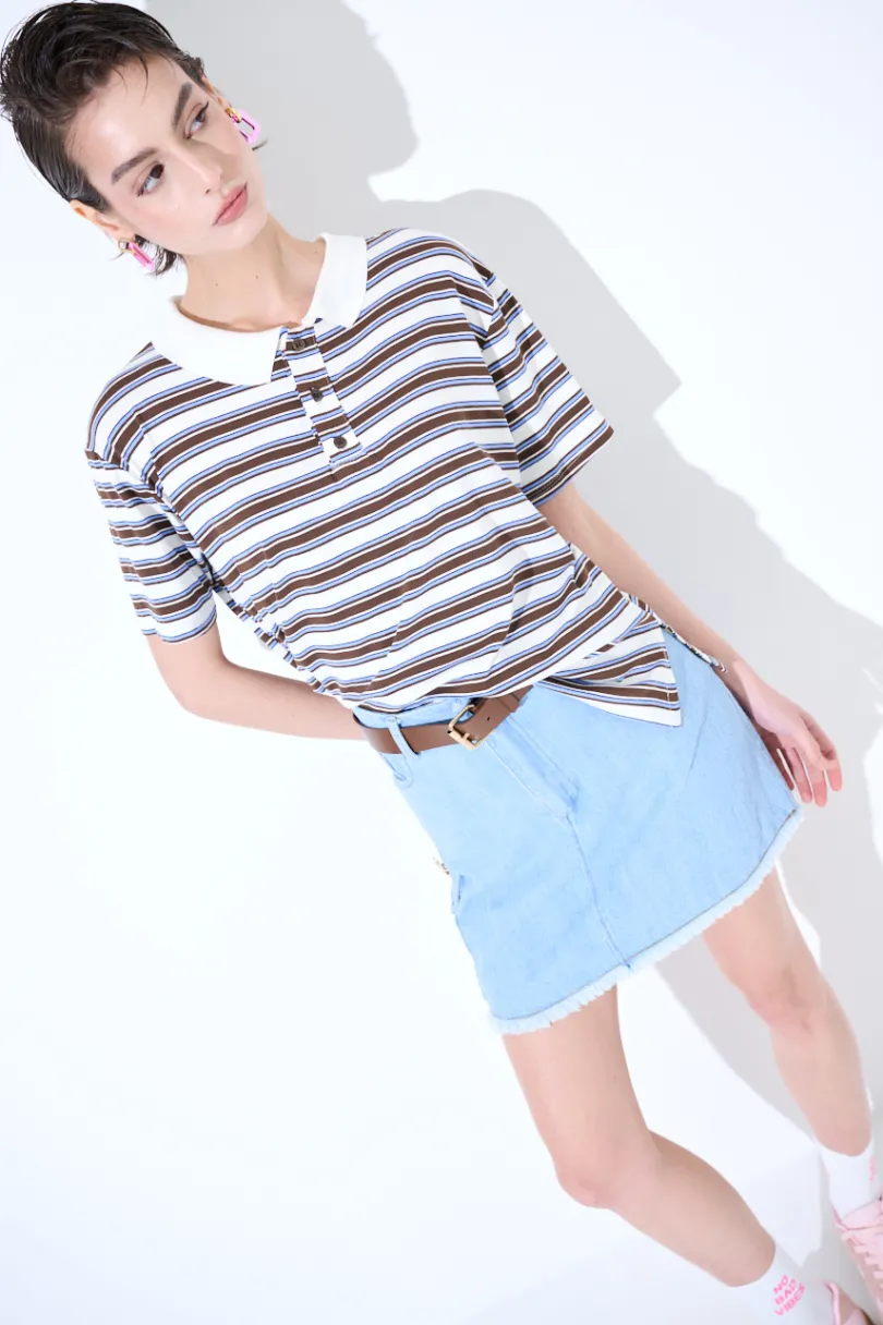 Polo a righe crop con colletto e abbottonatura, piccoli spacchi laterali e con mezze maniche.
