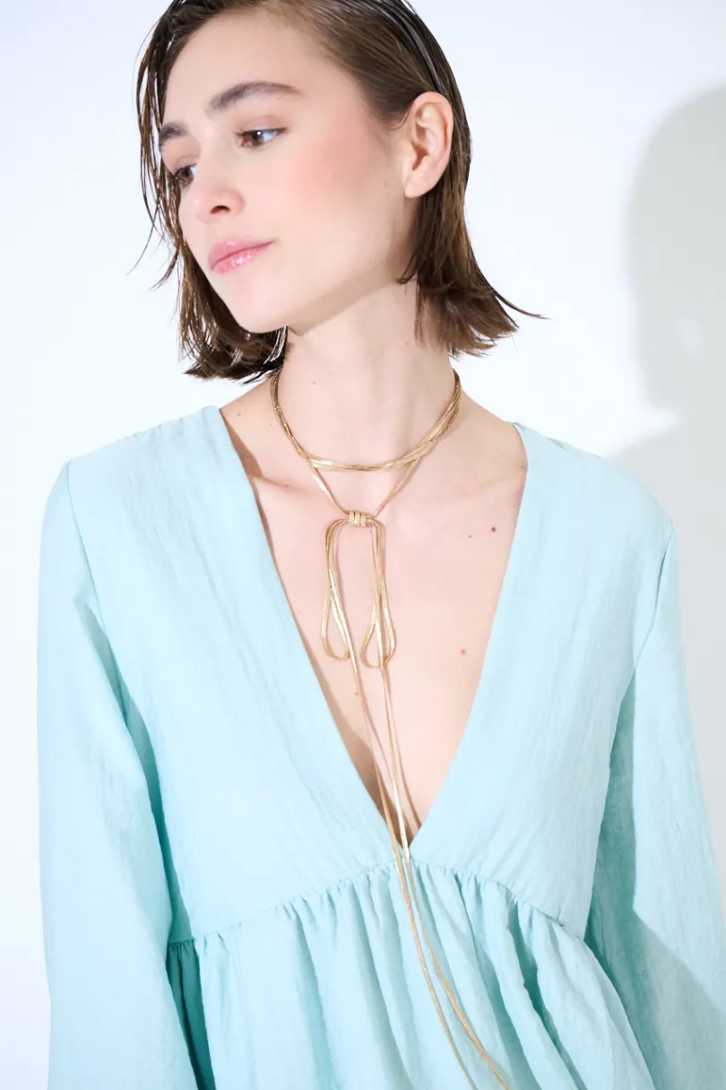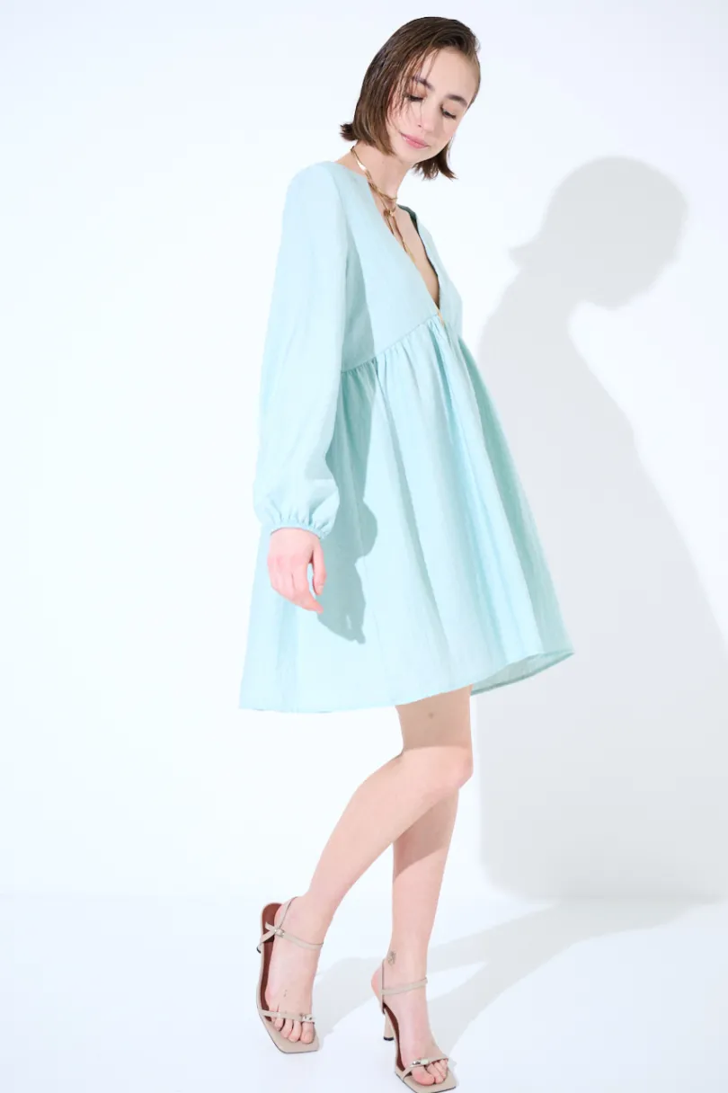 Abito corto in viscosa effetto mosso, con ampio scollo, elasticizzato in vita e sul polsino.