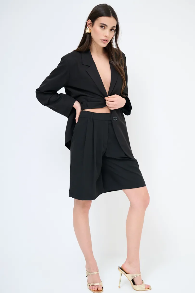 Bermuda in cadì con pinces frontali e chiusura con bottone e zip.