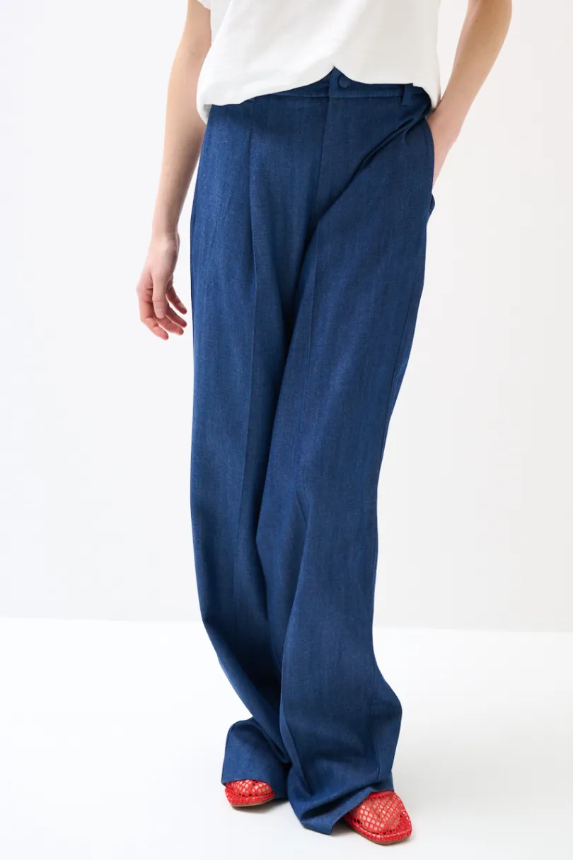 Panta denim a palazzo con piega centrale e pinces, bottone foderato e passanti per cintura.