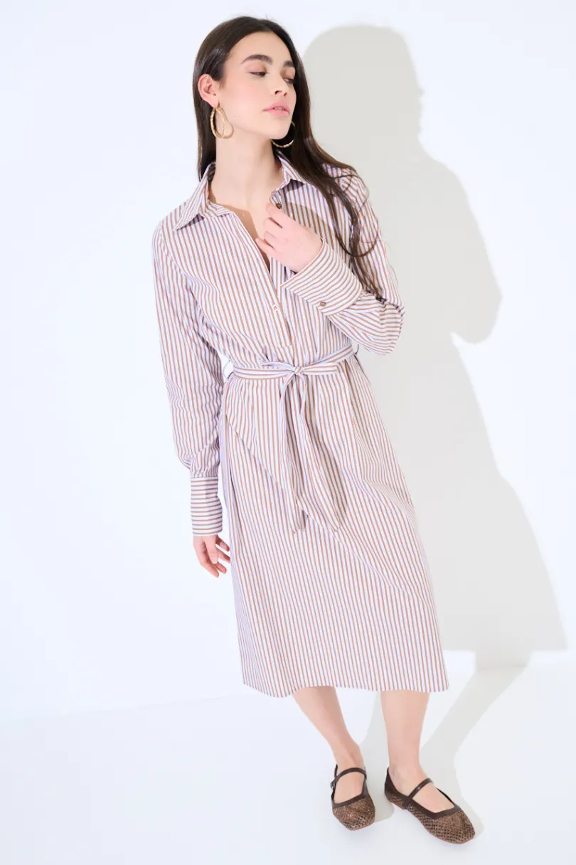 Abito midi a righe con collo camicia, manica lunga con polsino alto e abbottonato fino allo scollo, con cintura in vita.