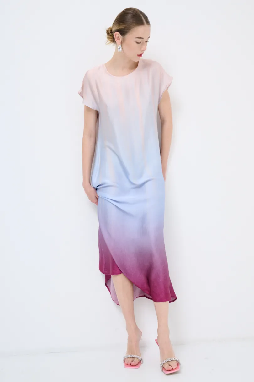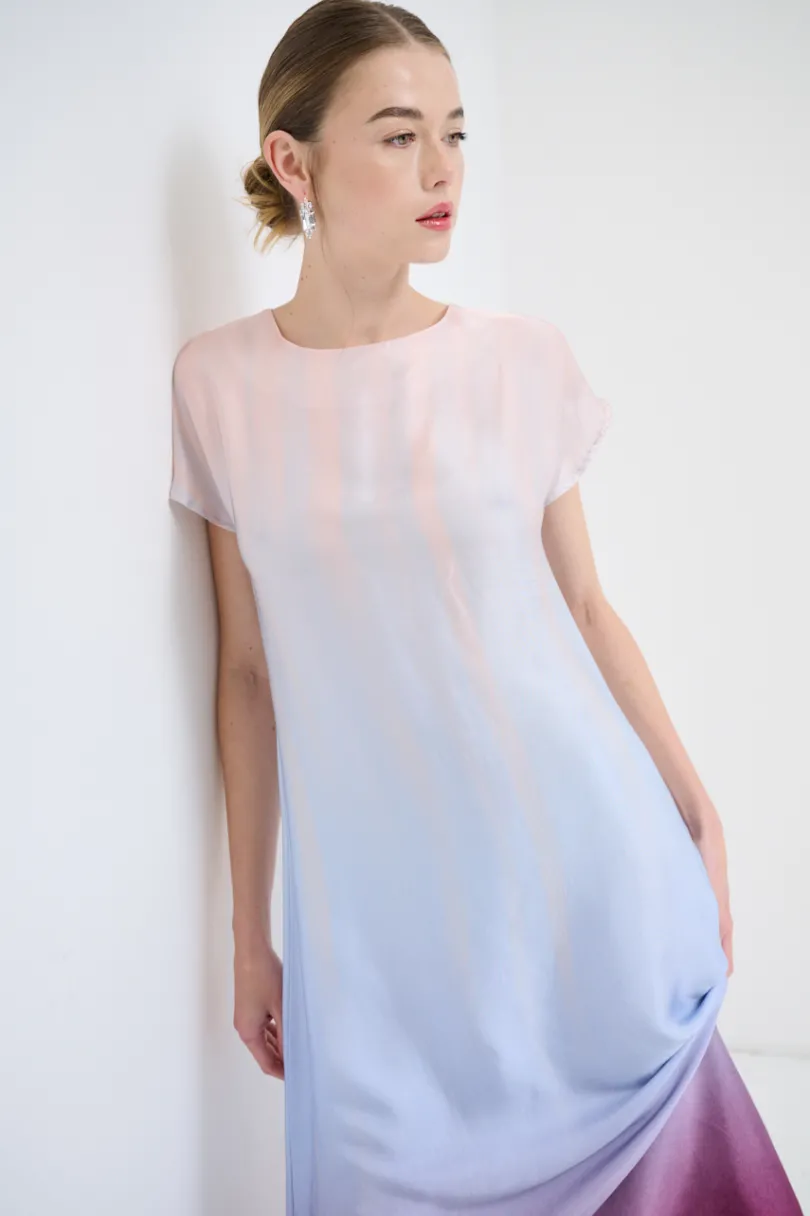Abito lungo sfumato sul fondo, con manica calata ad aletta, scollato a goccia sul retro.