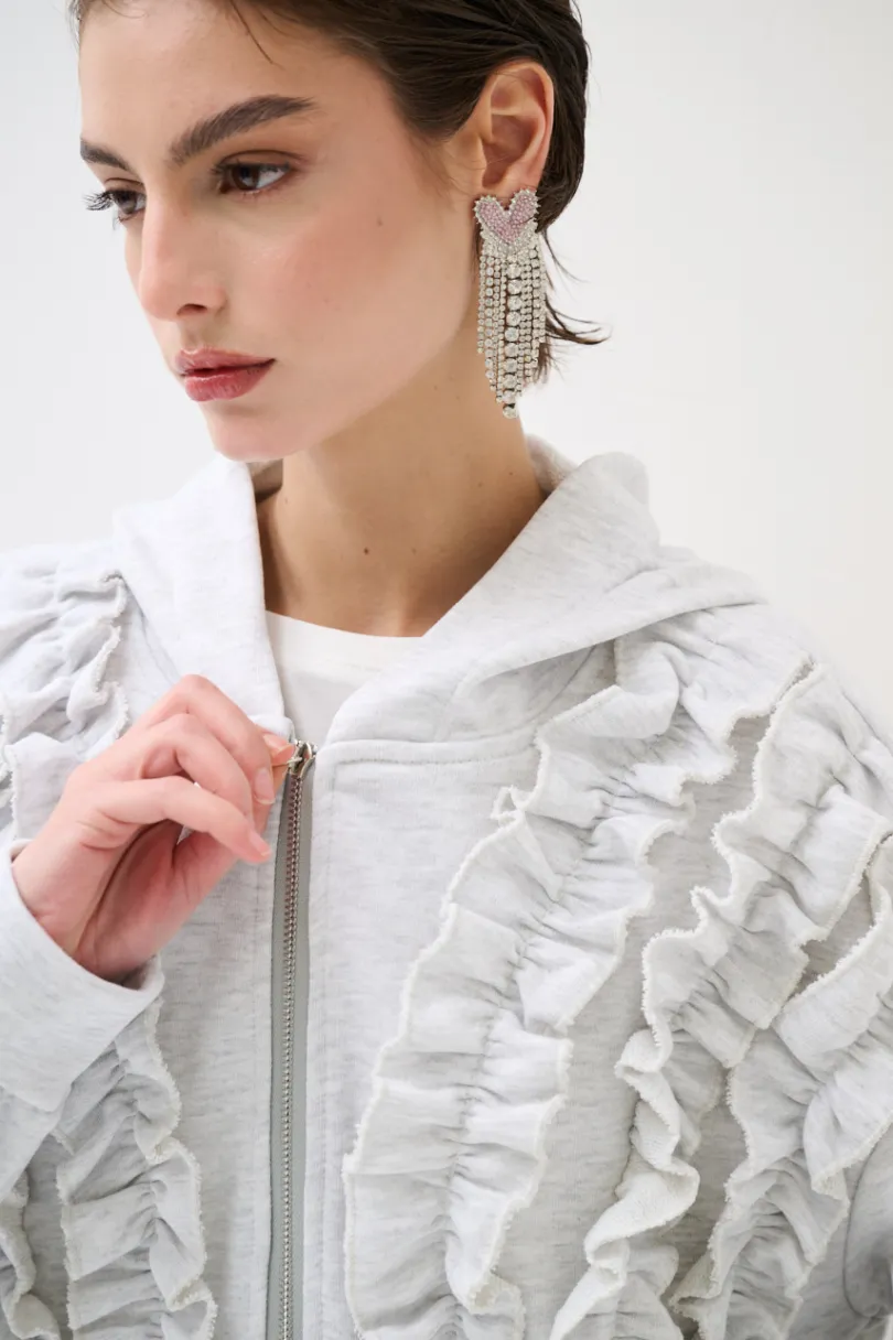 Felpa con cappuccio e chiusura a zip, con multi rouches sul davanti, tasche frontali e garzata internamente.