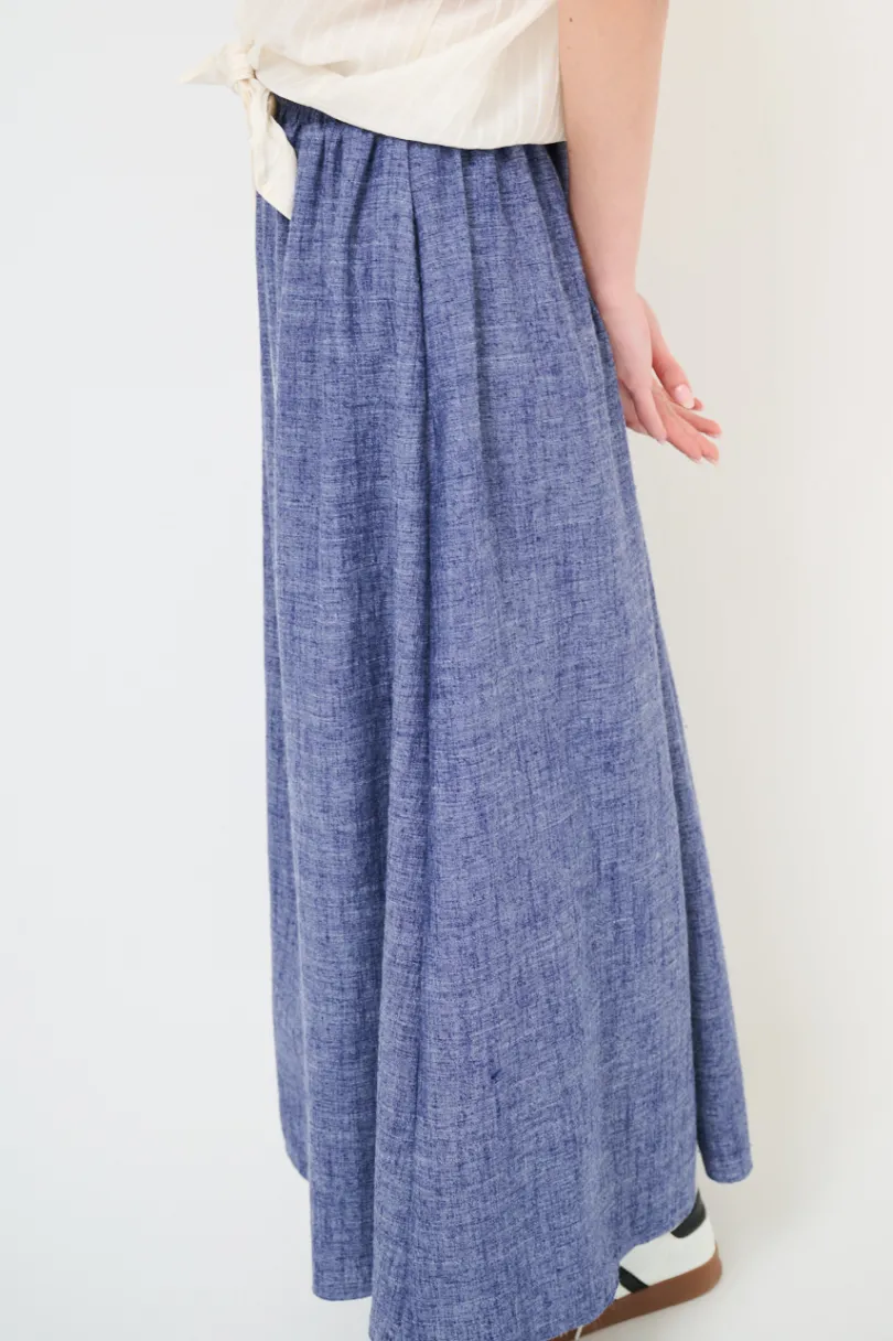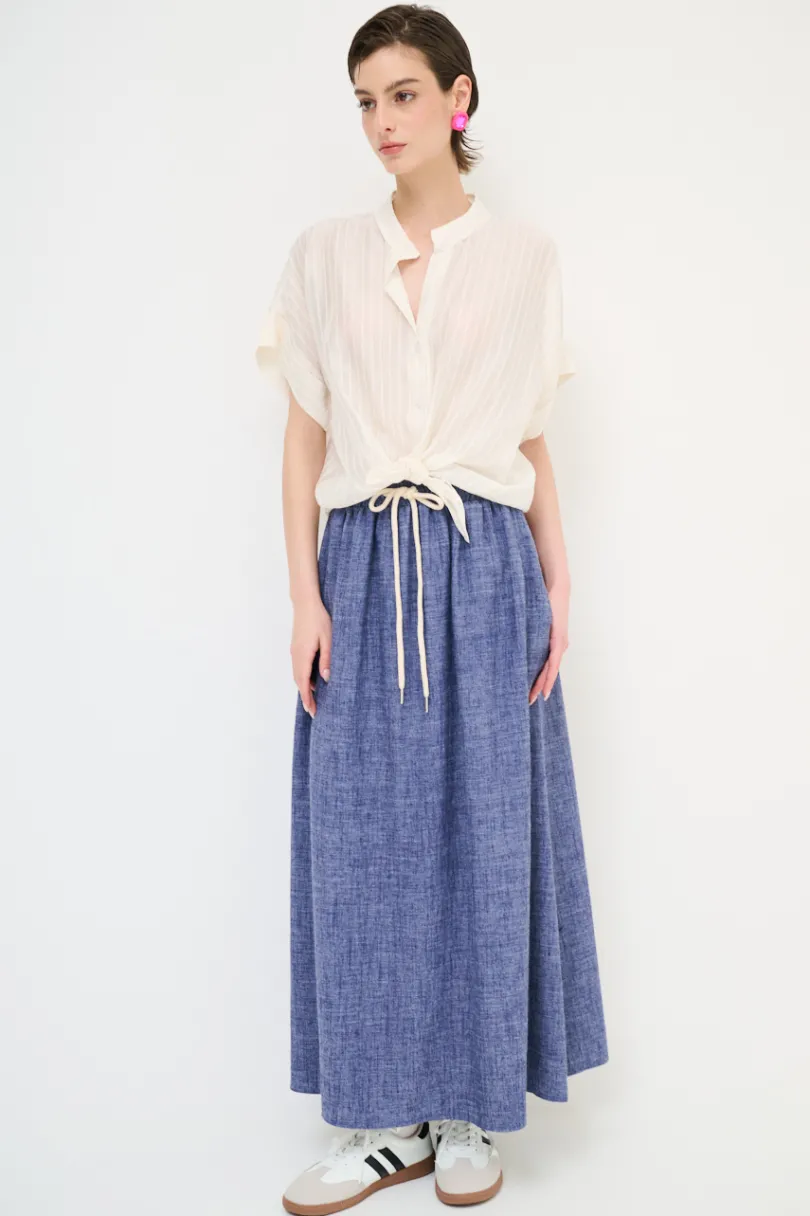 Gonna lunga in misto viscosa e lino, con vita elasticizzata e coulisse.