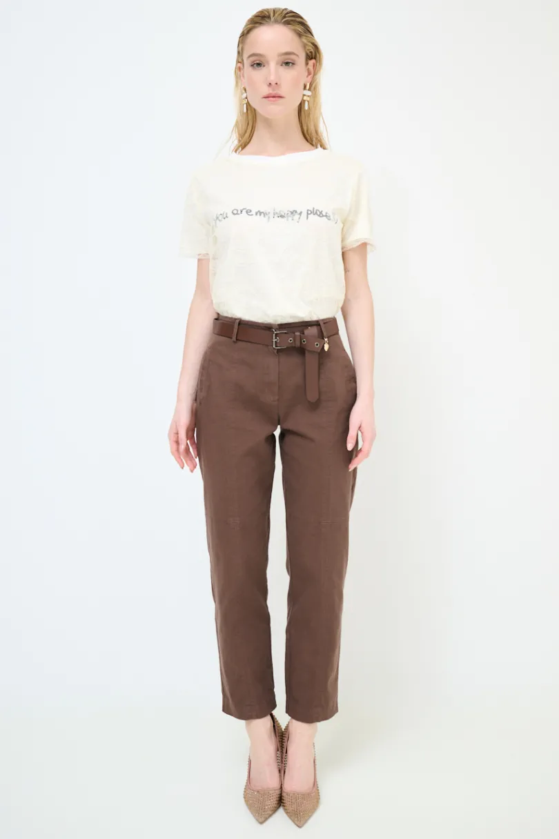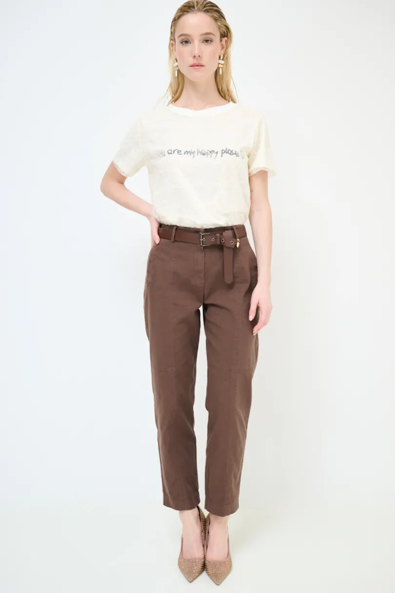 Pantalone dritto con doppie impunture frontali e tasche a filetto, e cintura con pendaglio cuore dorato.