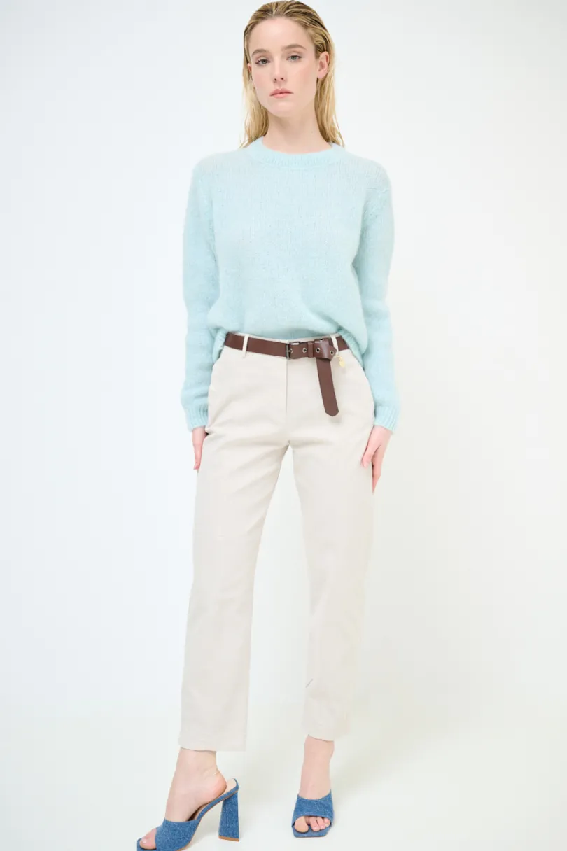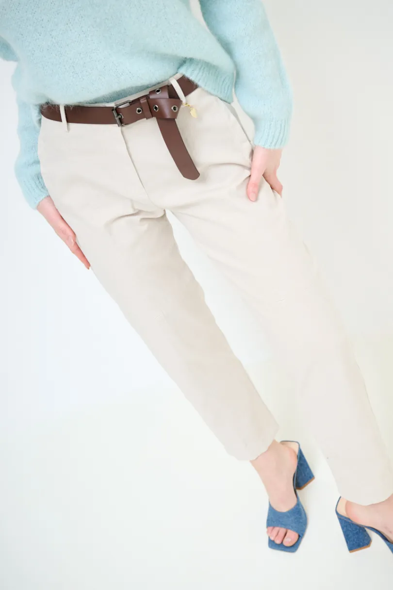 Pantalone dritto con doppie impunture frontali e tasche a filetto, e cintura con pendaglio cuore dorato.