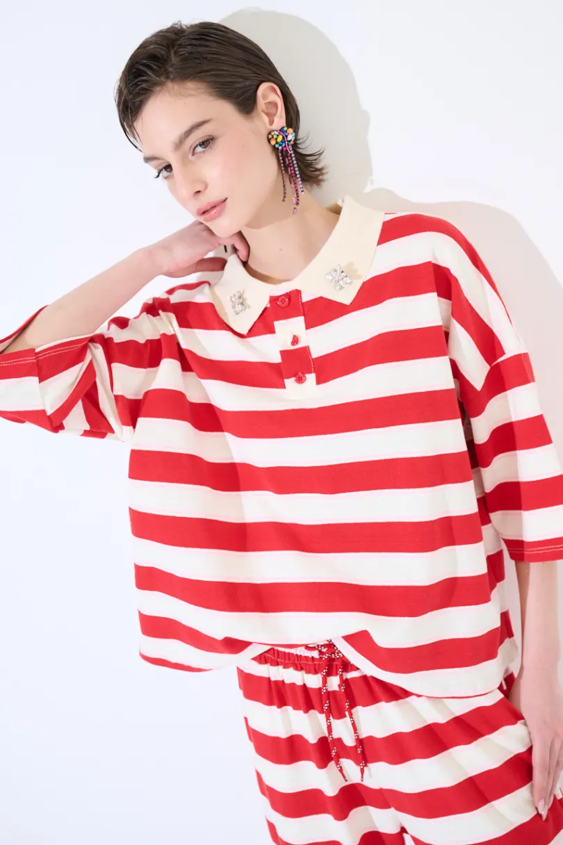 Polo box fit a righe con manica a 3/4 e dettaglio di applicazioni gioiello sul colletto.