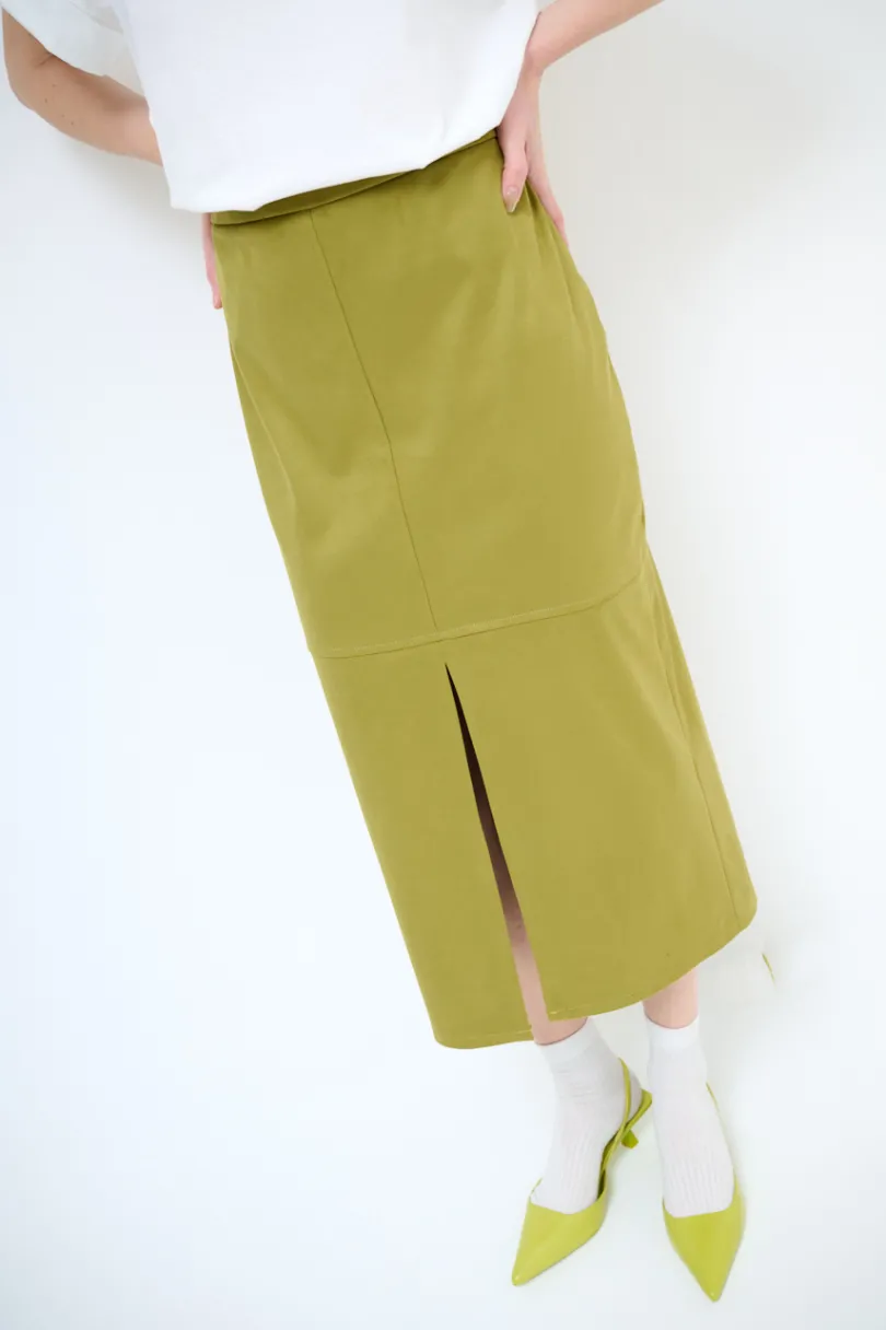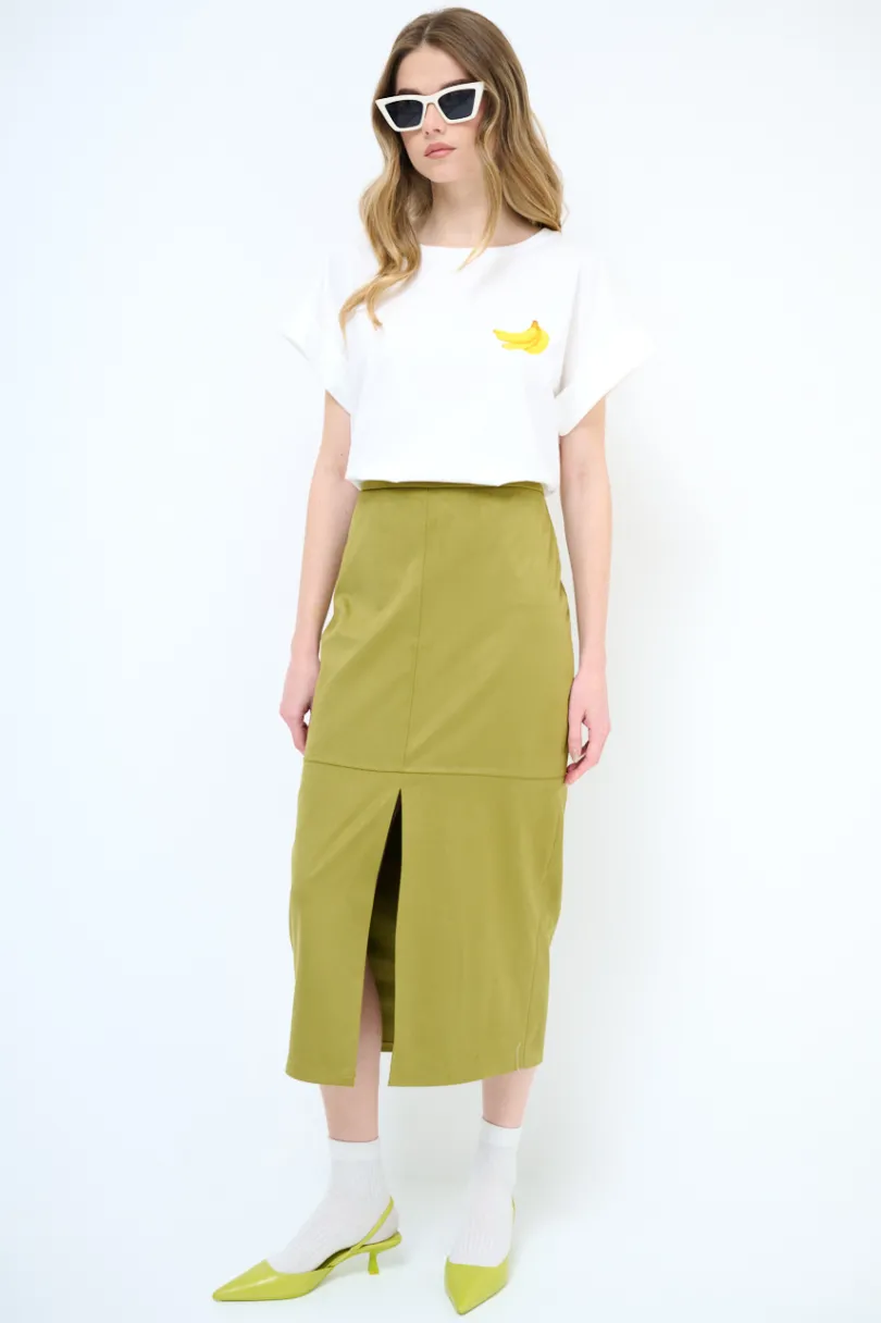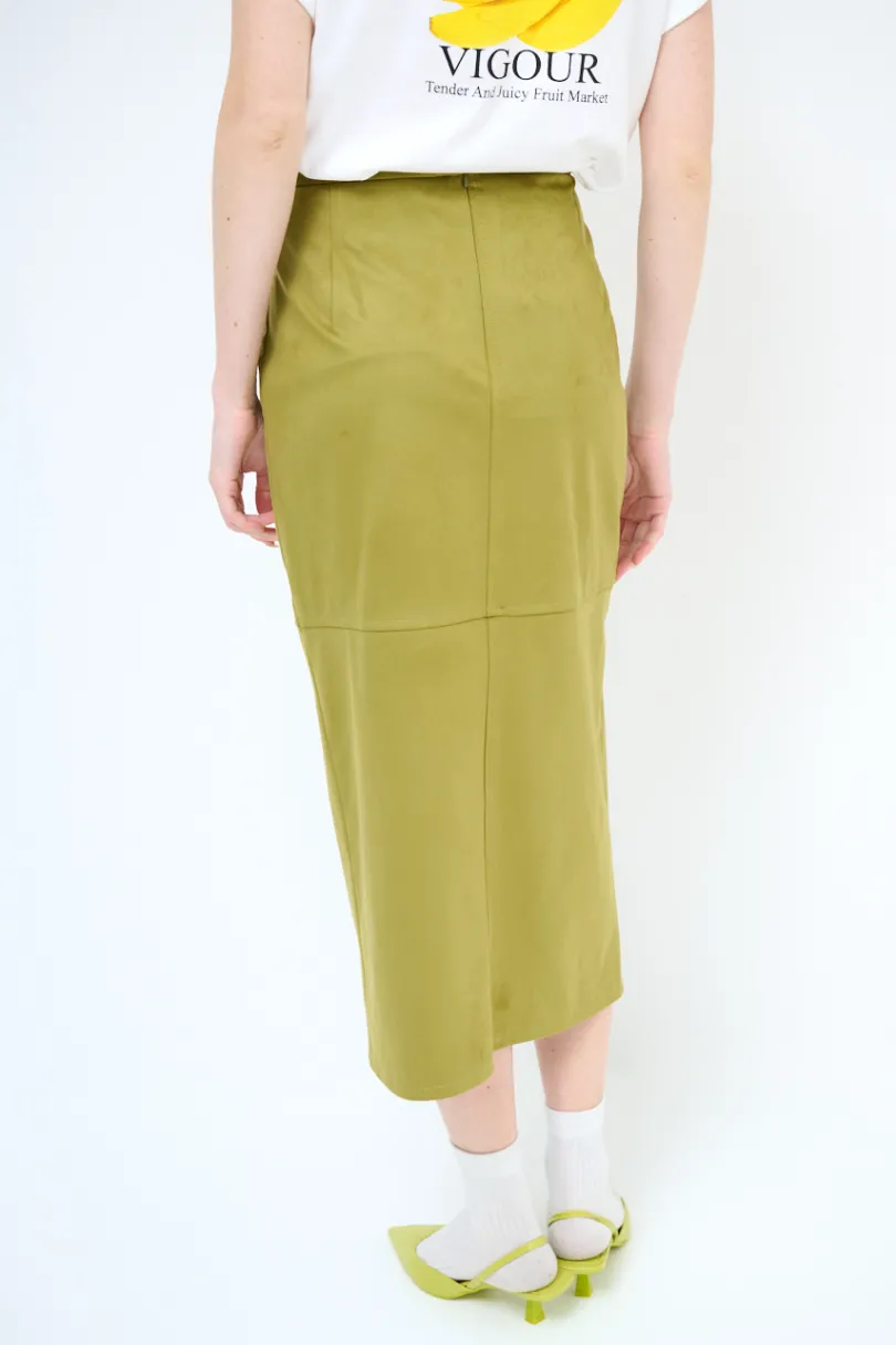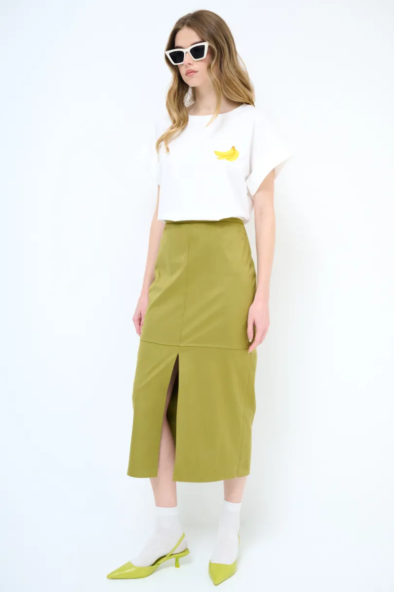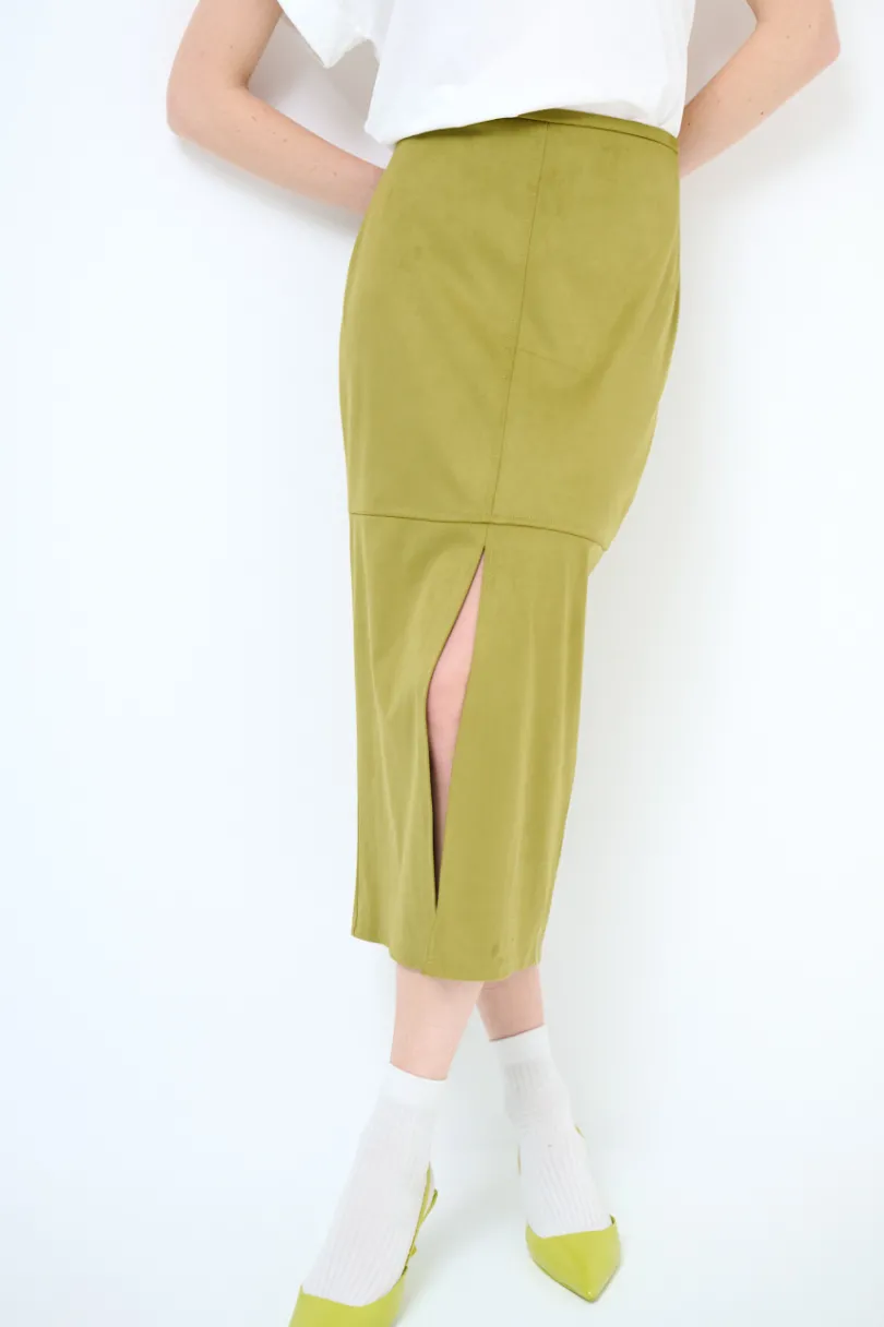Gonna midi in eco dainetto con spacco frontale e chiusura con zip nascosta sul retro.