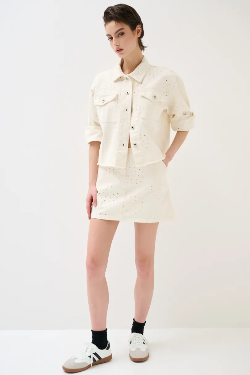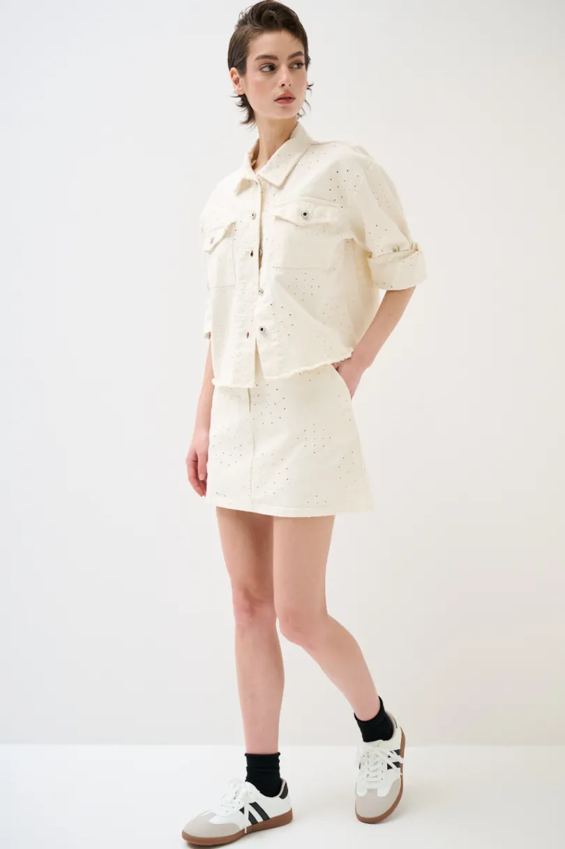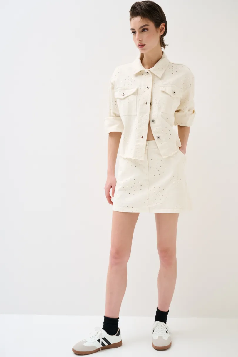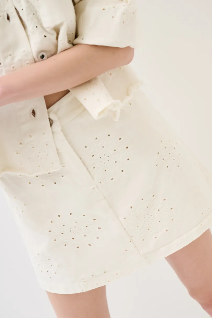 Minigonna in cotone ricamato con disegno, chiusura con bottone e zip.