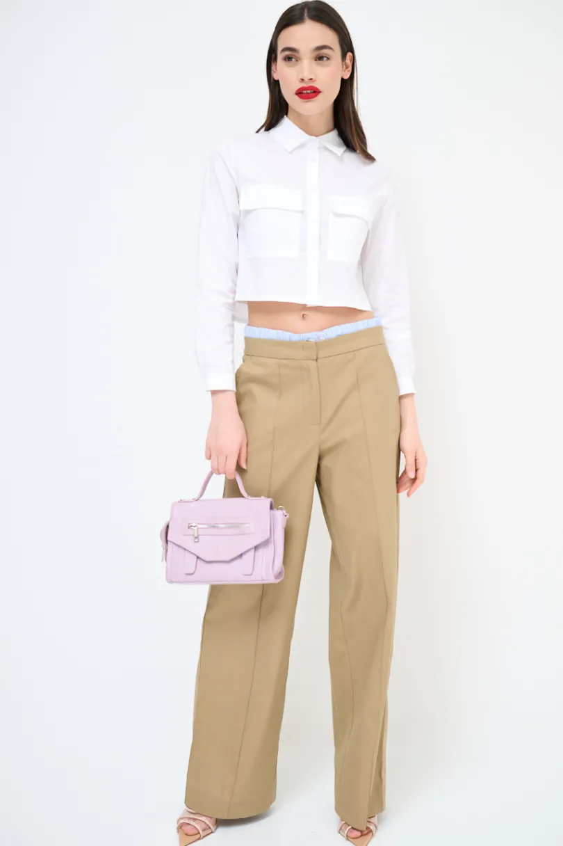 Pantalone dritto in cotone con cucitura centrale e doppio tessuto in vita effetto boxer, finte tasche a filetto sul retro.