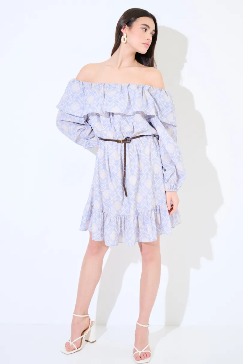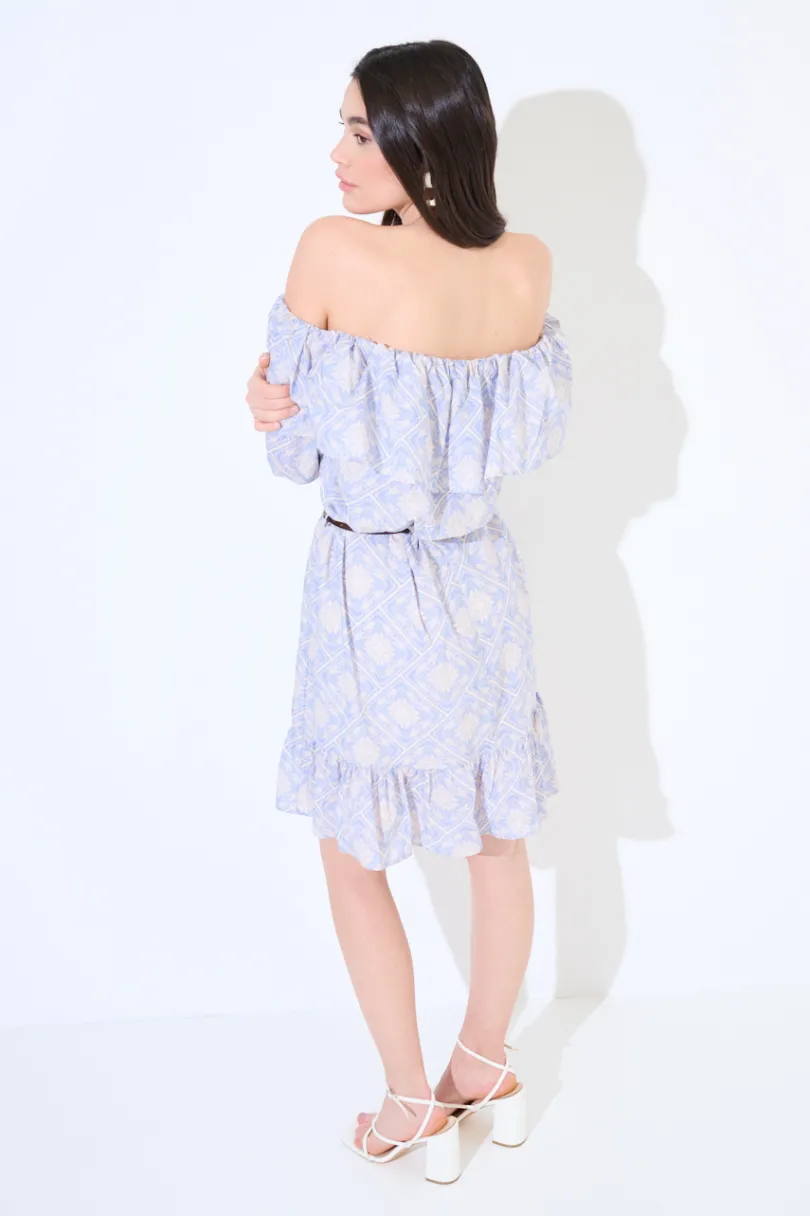 Abito corto a fantasia con spalle scoperte, balza sullo scollo e cinturino in vita.