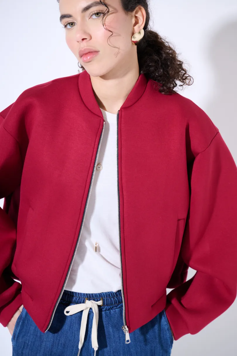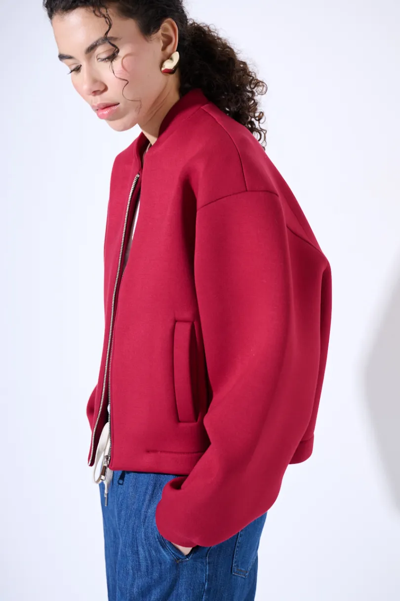 Bomber corto in neoprene con collo a coreana, zip centrale e tasche verticali a filetto.