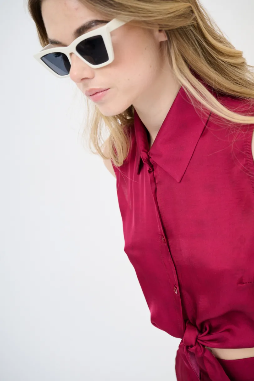 Camicia crop con nodo sul fondo, smanicata e abbottonata frontalmente.