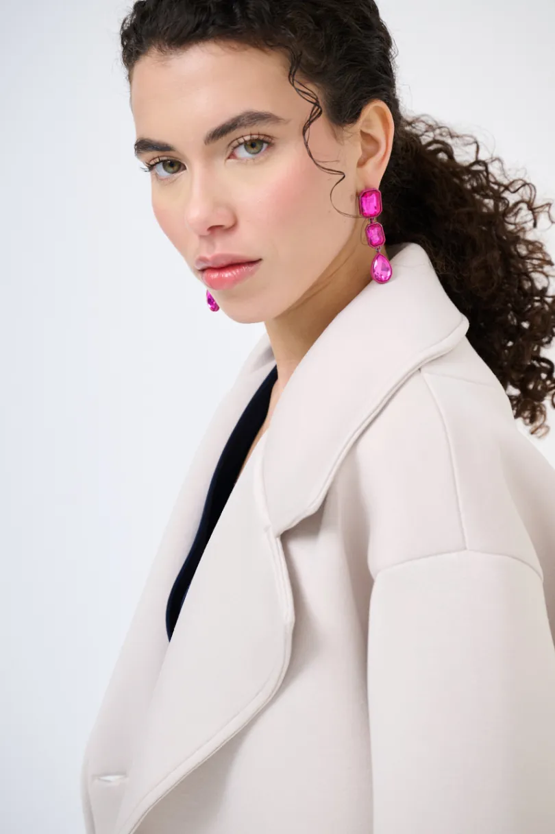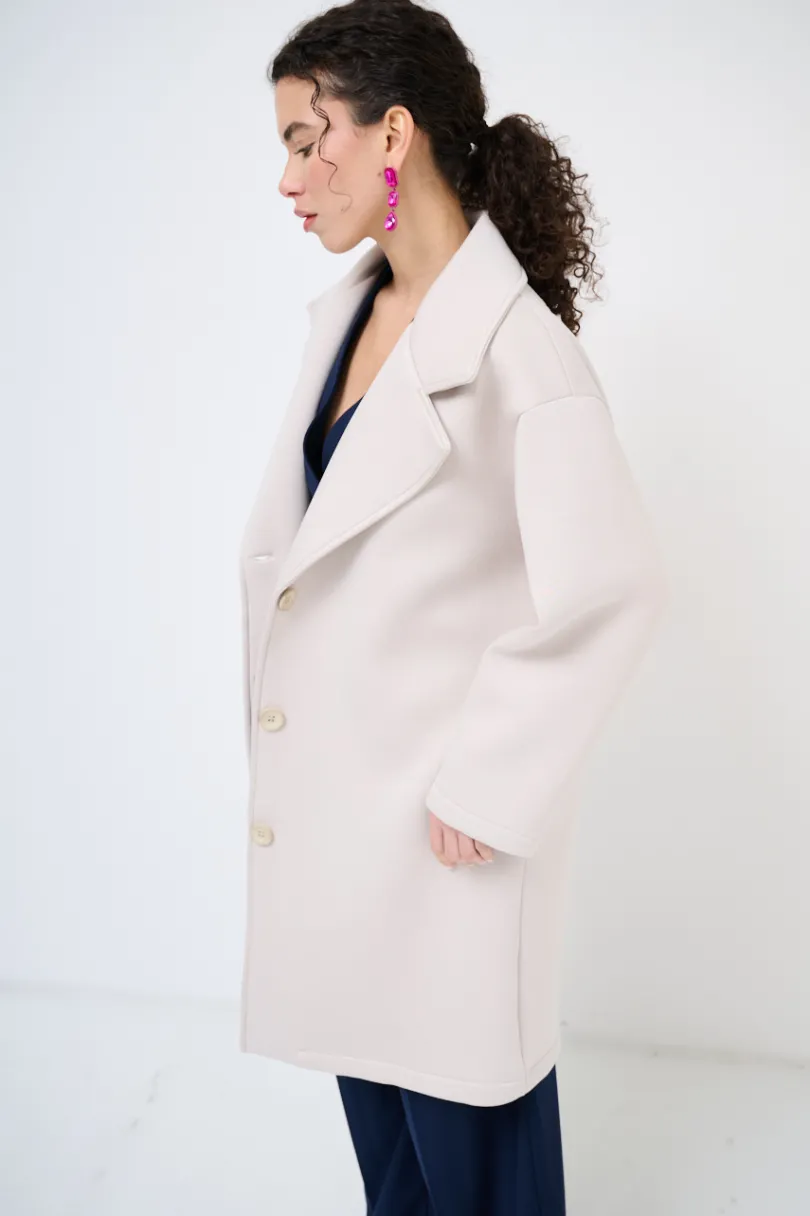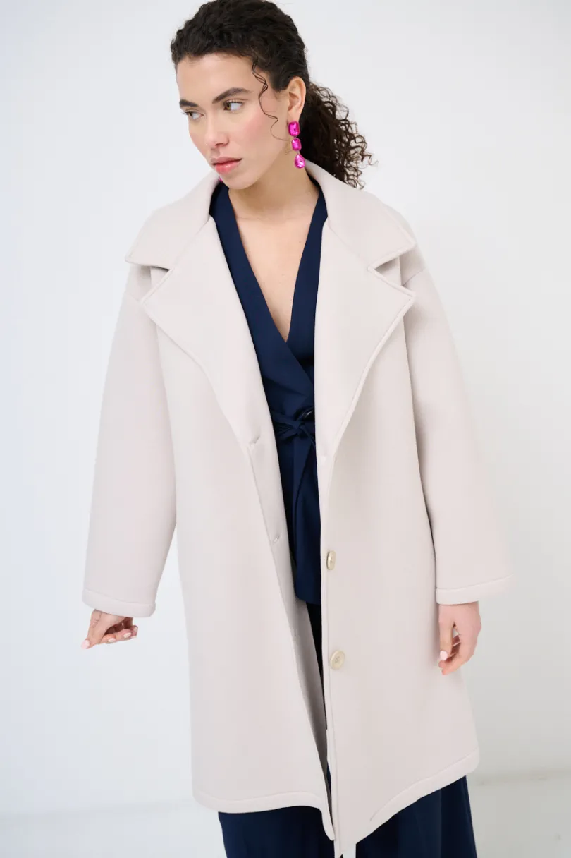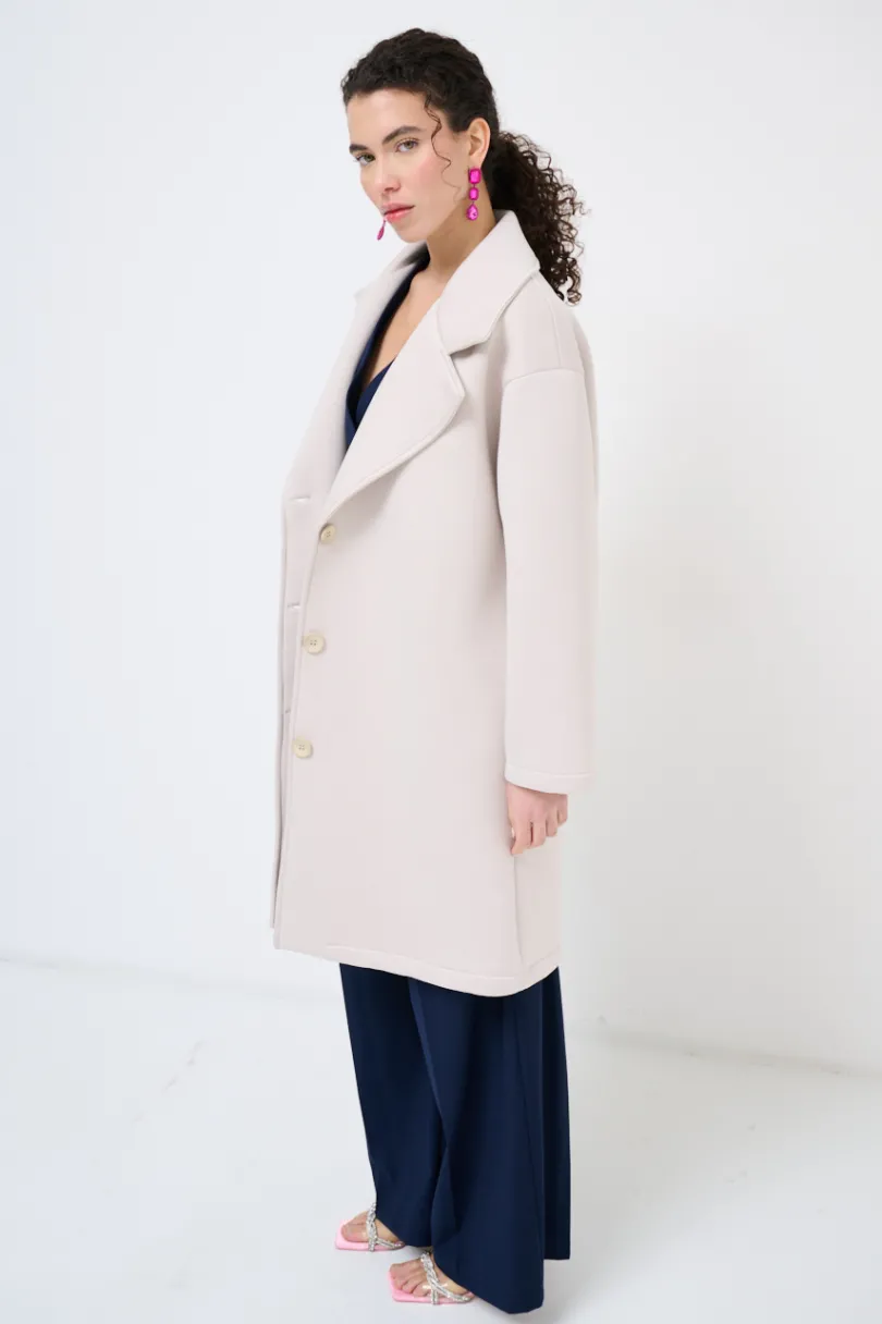 Cappotto classico a tre bottoni in neoprene con tasche nascoste sul fianco, con collo rever.