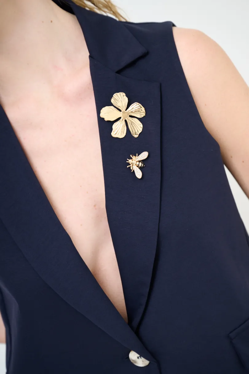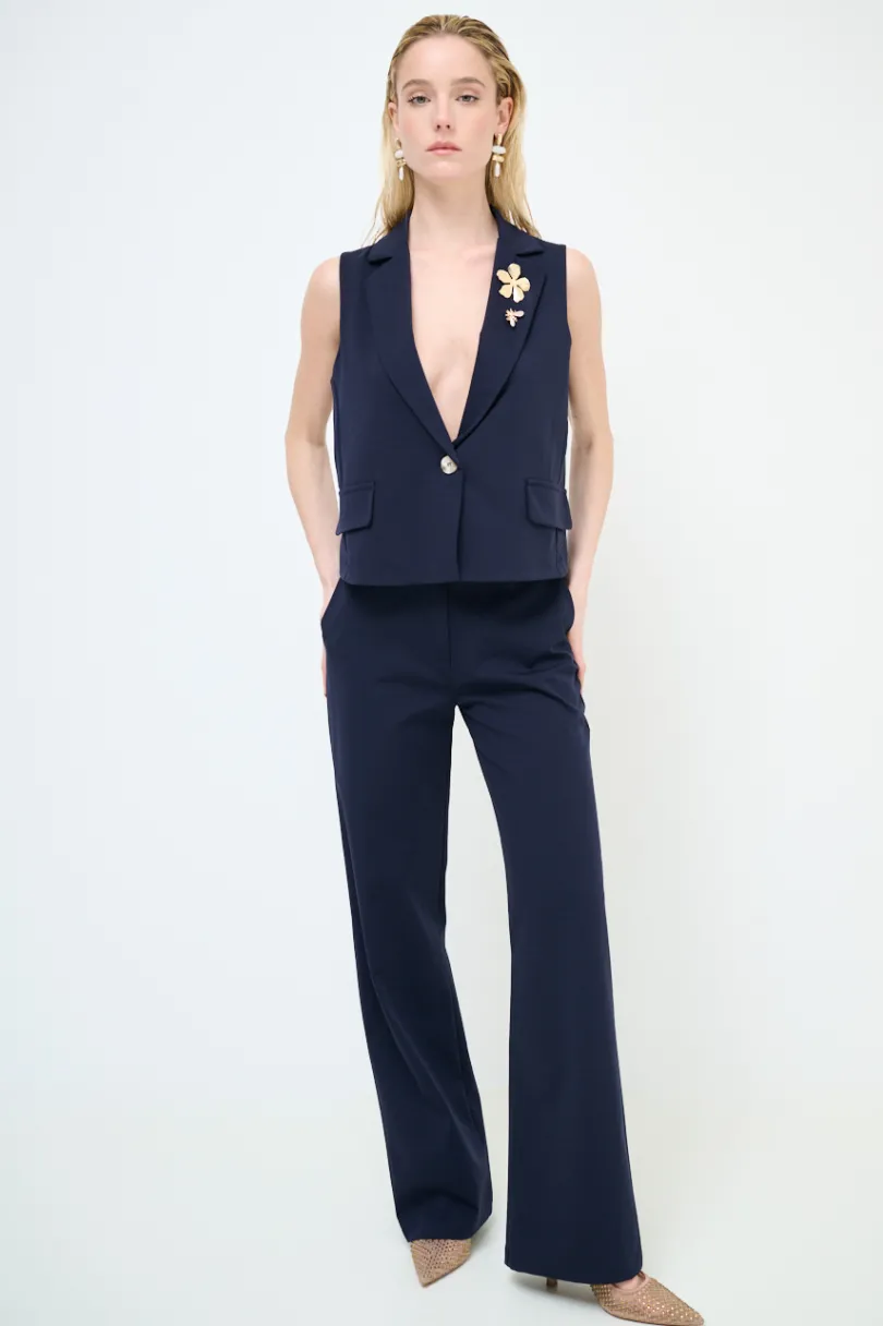 Gilet crop in punto milano a un bottone, con doppia spilla sul collo rever.