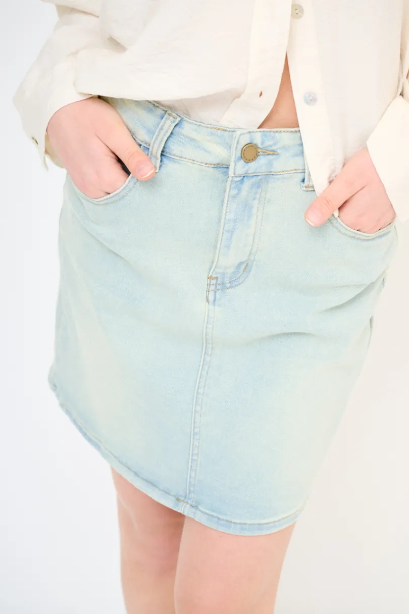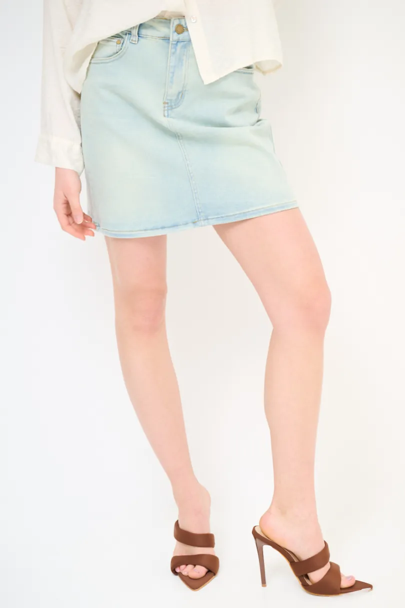 Minigonna in denim slavato a 5 tasche, chiusura con zip e bottone.