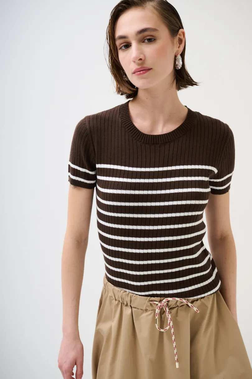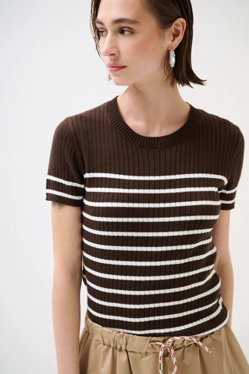 T-shirt a costine a mezza manica con righe verticali e girocollo.