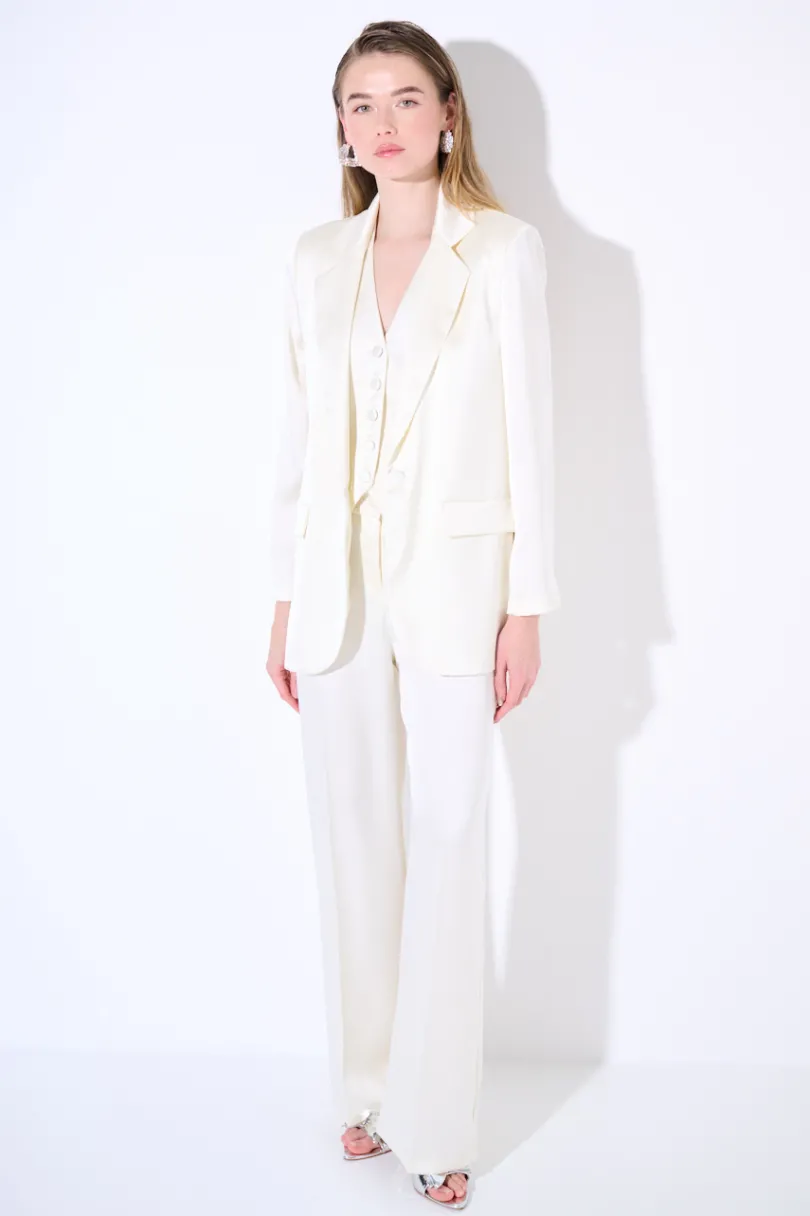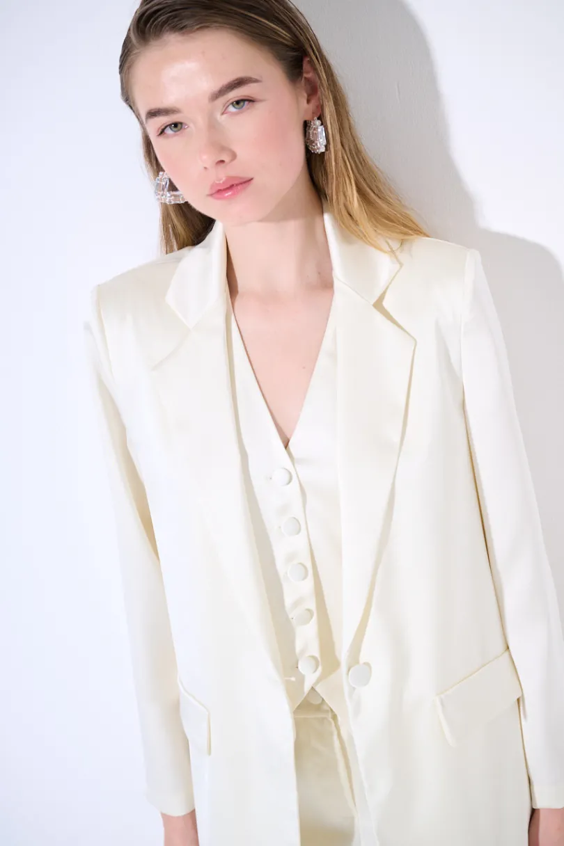 Giacca monopetto in raso con chiusura a un bottone ricoperto e con spalline imbottite.