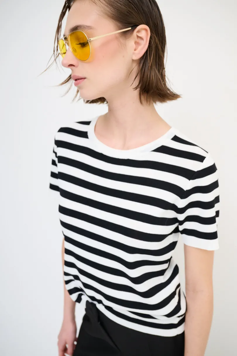 Maglia a mezza manica con righe orizzontali e girocollo.