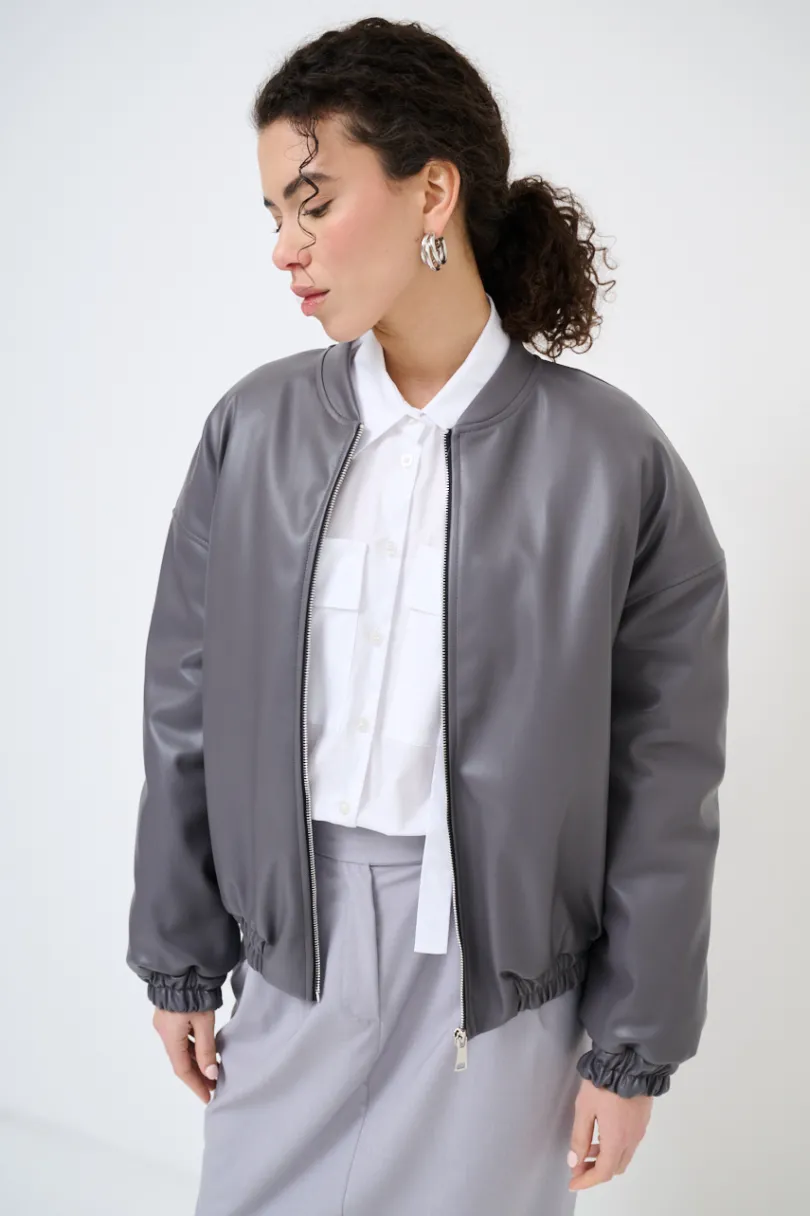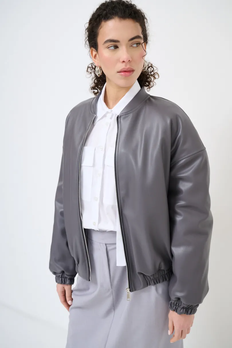Bomber imbottito in ecopelle con colletto a coreana, zip centrale ed elasticizzato sul fondo.