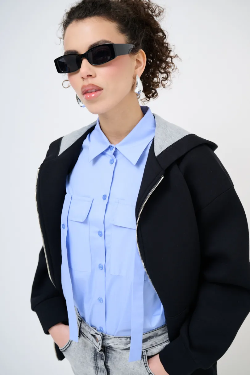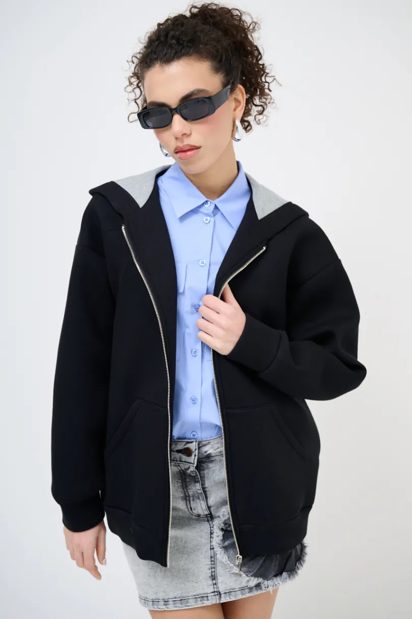 Felpa oversize lunga in neoprene con cappuccio e chiusura a zip centrale.